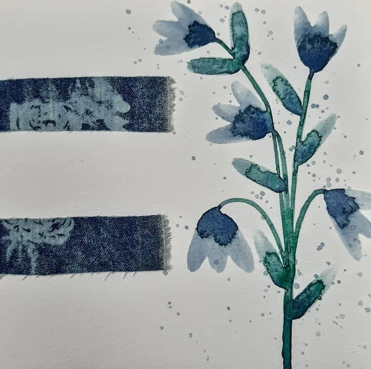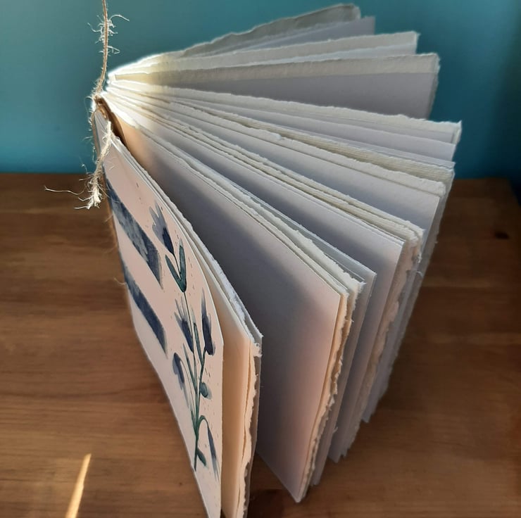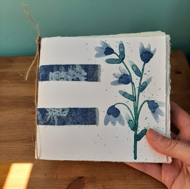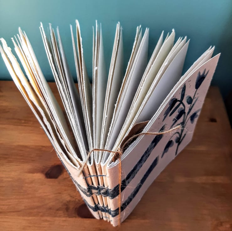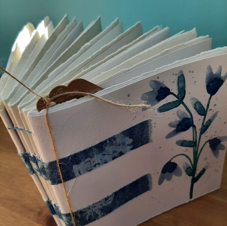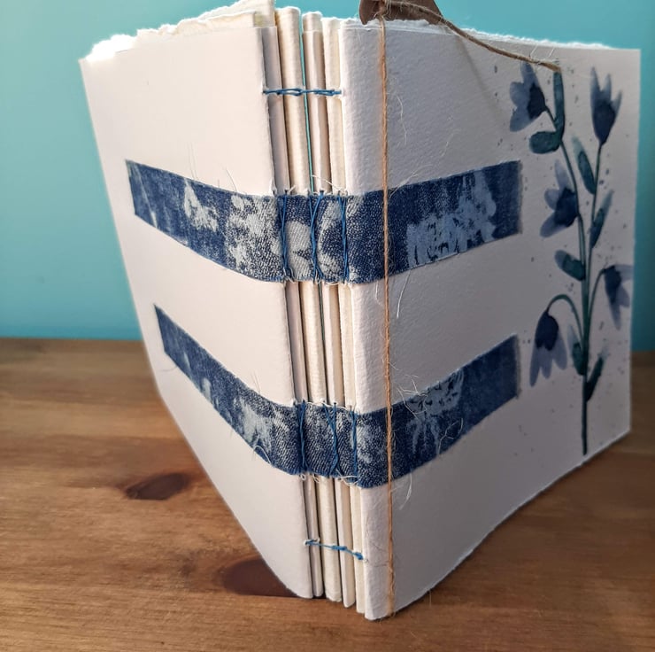 This coverless journal features a stem of hand painted indigo flowers on the front, and a stitched detail on the spine over denim fabric. Hand bound with a variety of different papers including recycled paper, Cupcycled (Seawhites paper made from recycled paper cups) and 2 weights of Khadi (cotton) paper.