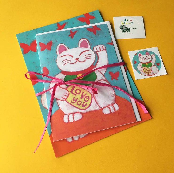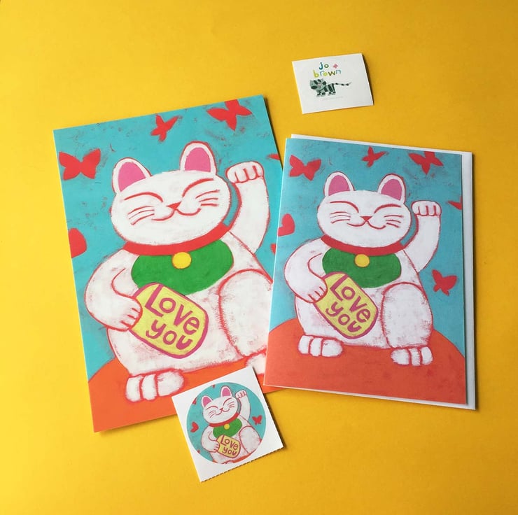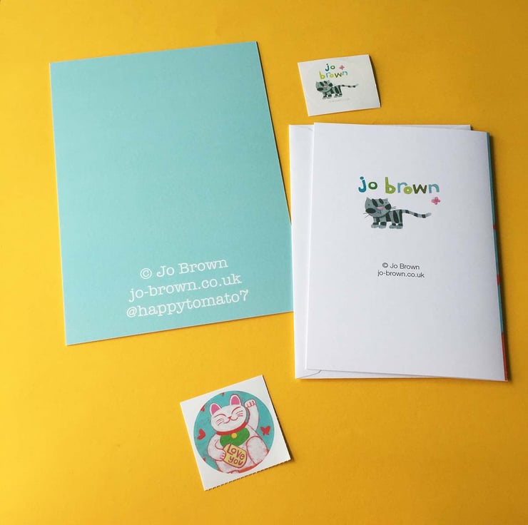 a 5 x 7 inch mini art print, professionally printed on velvety matt 330gsm card, an A6 greetings card and a matching glossy sticker all featuring illustrations by Jo Brown, Illustrator. (card has white envelope and Jo Brown cat logo sticker to seal)
