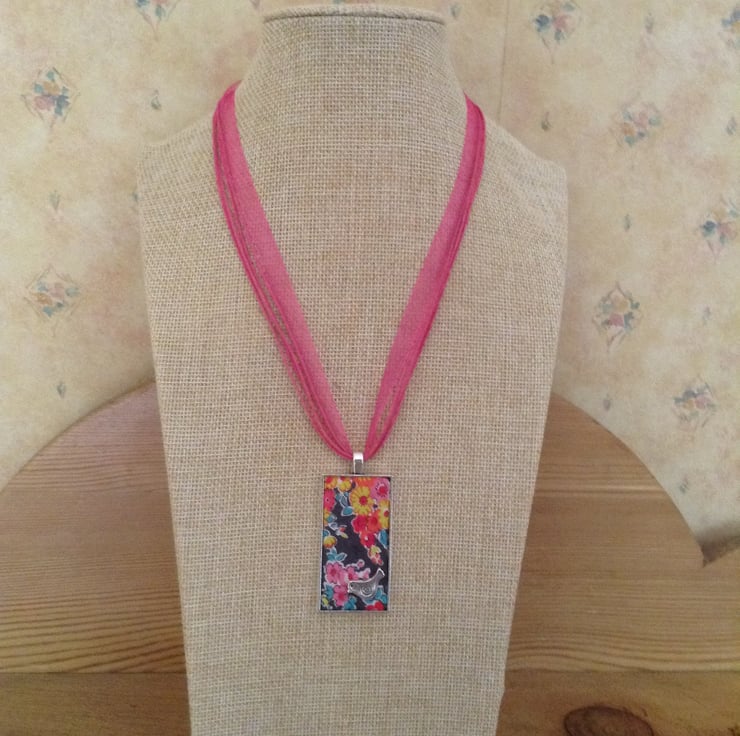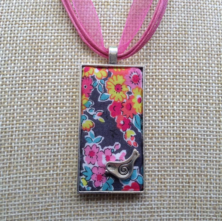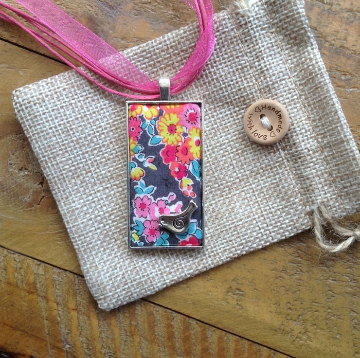 I have wrapped some Liberty tana lawn fabric around a felt padded cabochon, attached a little bird bead and set it in a 2x1 inch rectangular silver metal pendant tray.