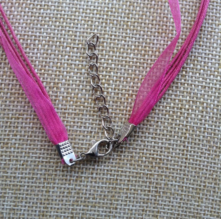 It hangs from an organza and waxed cotton cord that measures 18 inches long (not including the 1.5 inch extender chain.