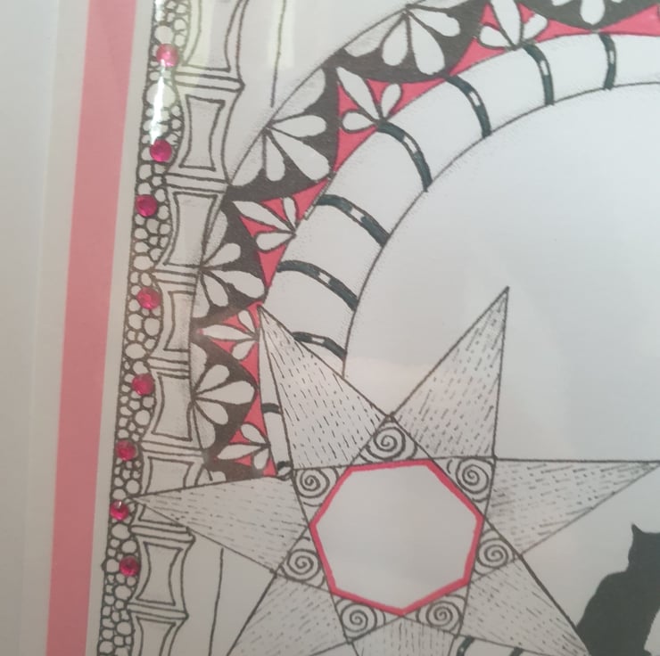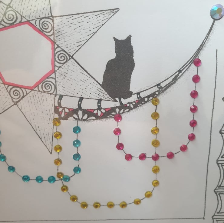 The image has been created using stencils for the outline and the zentangle patterns and features added to create this lovely card.