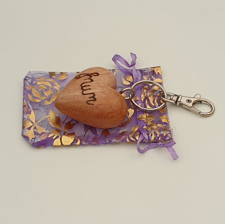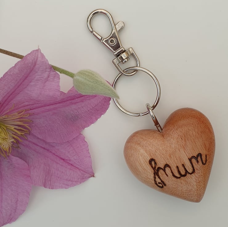 Lovely quality, solid beech wood keyring. The wooden heart has been handburnt, using the art of pyrography, with the word 'mum'. The heart has then been given several coats of varnish for protection. There is a metal silver coloured hoop screwed into the top of the heart and a lobster clasp keychain attached.