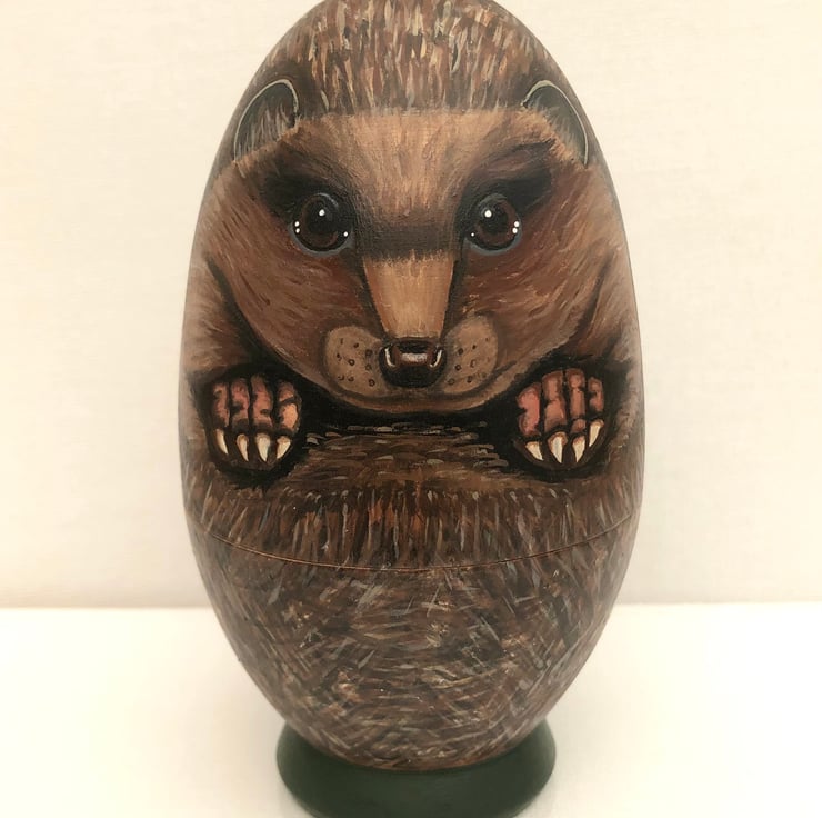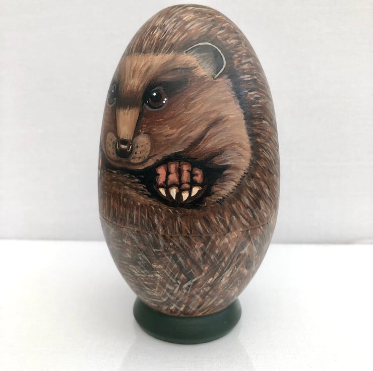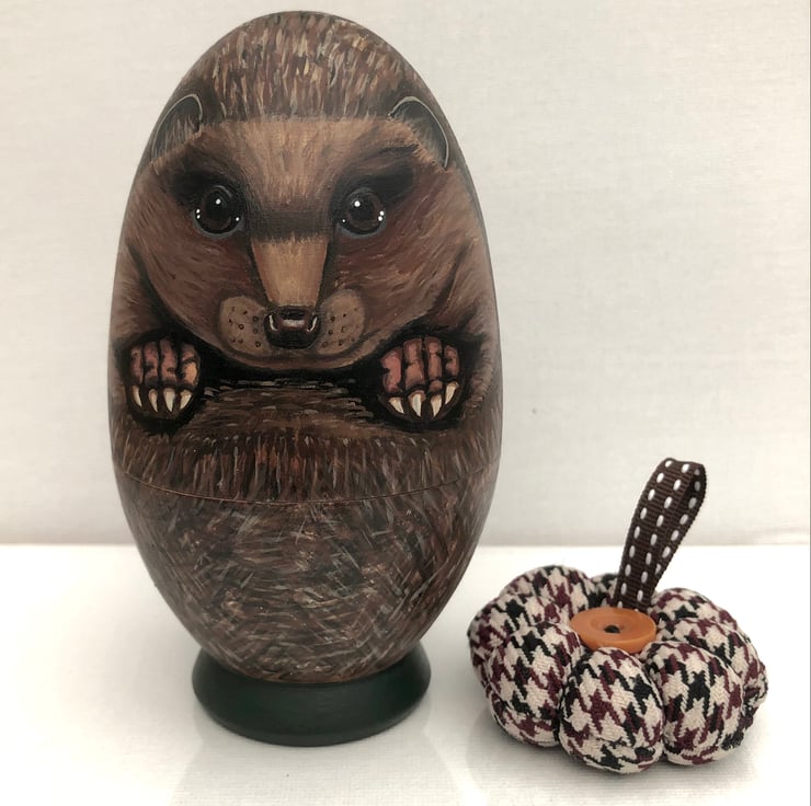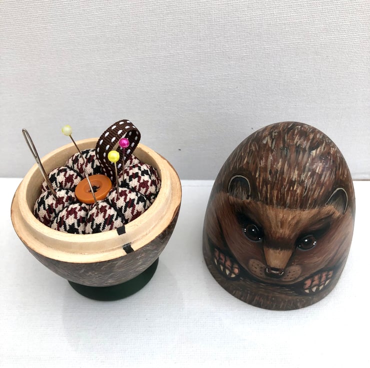 This prickly character has been hand painted on to a soft wood egg , which opens up to reveal a pin cushion and small storage space.