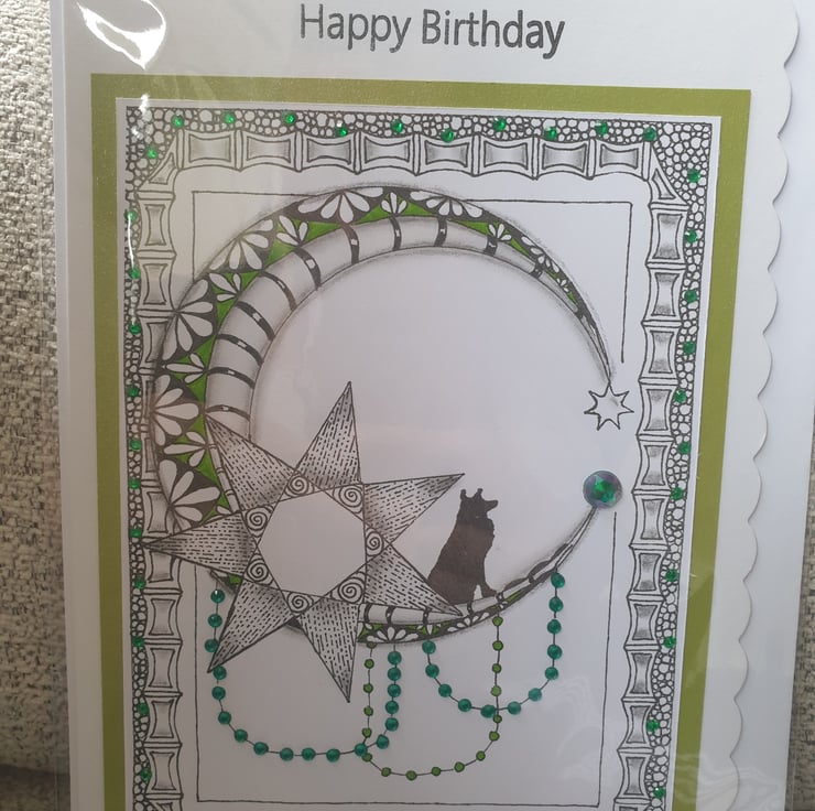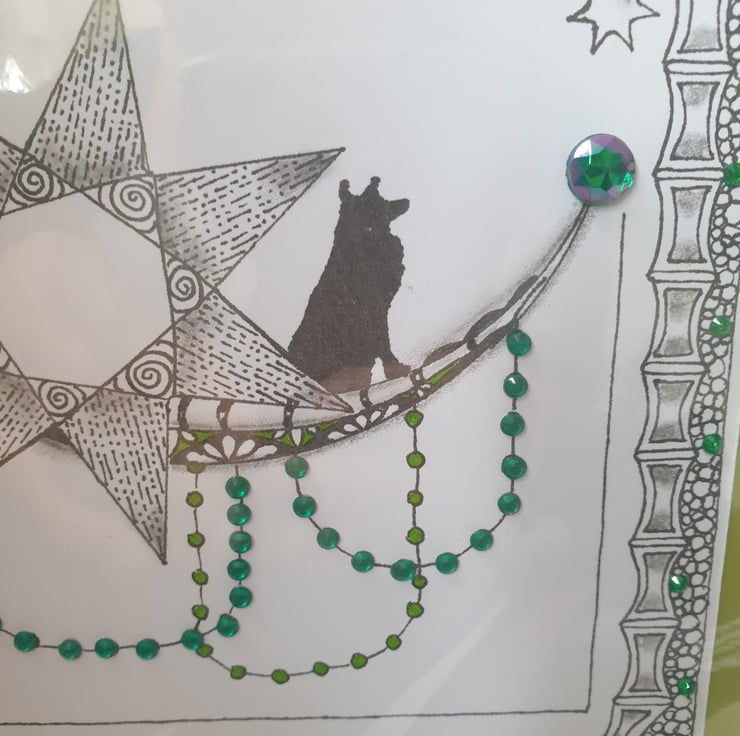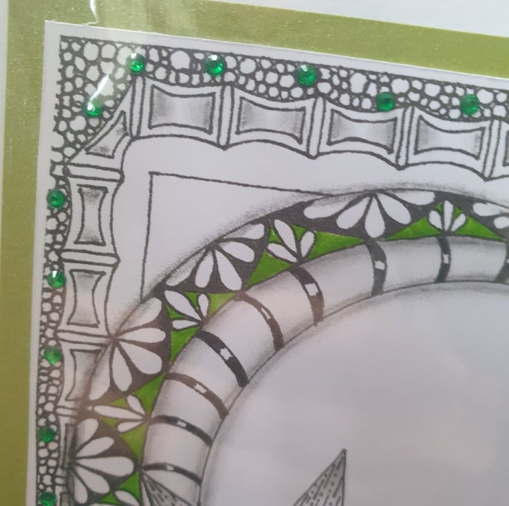 The image has been created using stencils for the outline and the zentangle patterns and features added to create this lovely card.