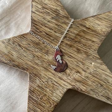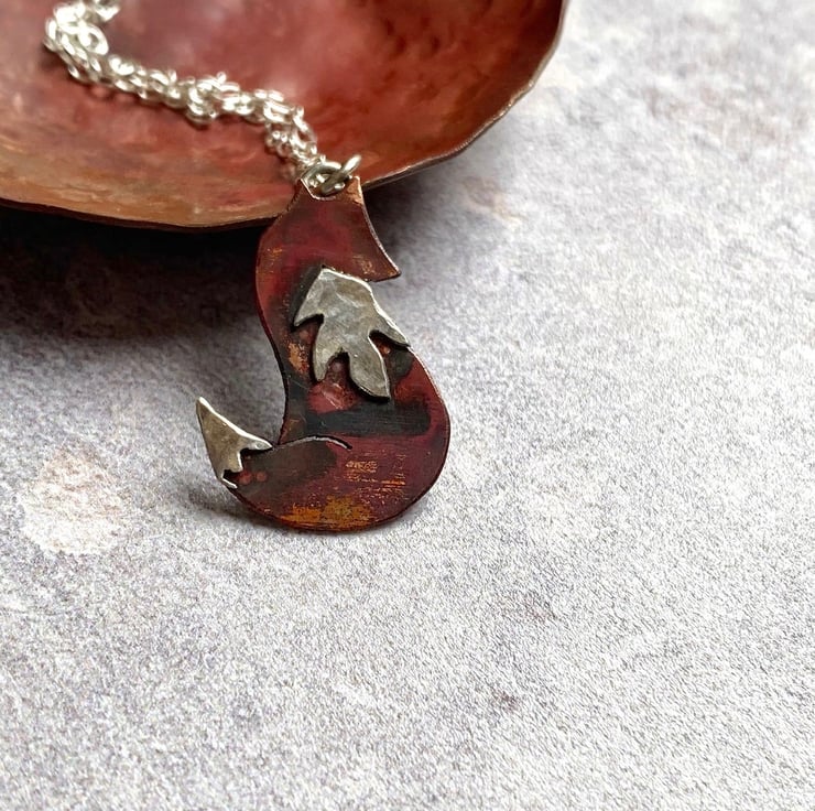 The gorgeous colour on the copper fox pendants happens naturally when the metal is heated to a high temperature whilst soldering on the sterling silver tail tip and bib. The colours vary from piece to piece, and added to that each fox is hand sawn individually so you get a unique fox with its own personality!