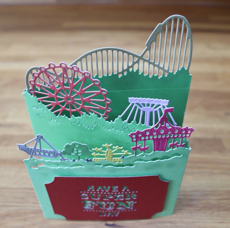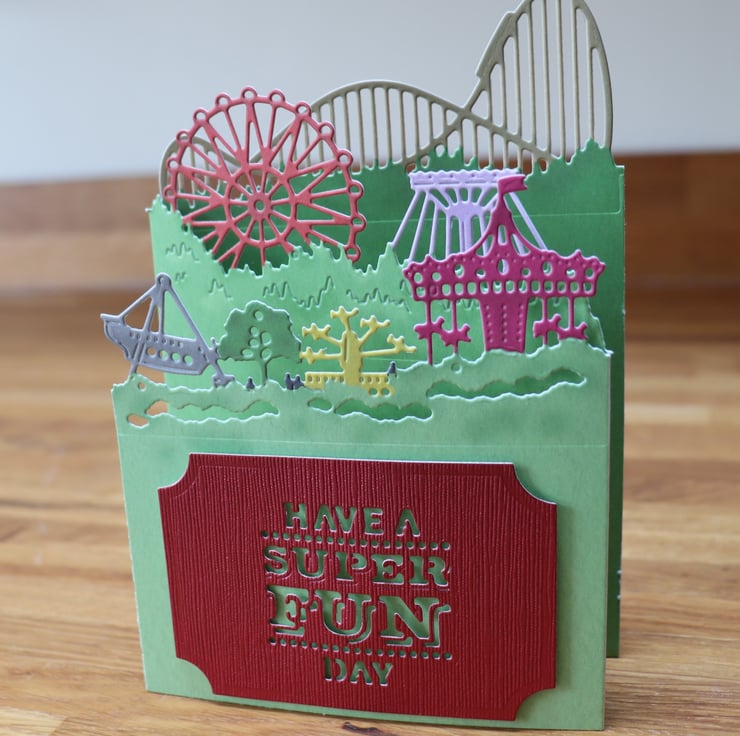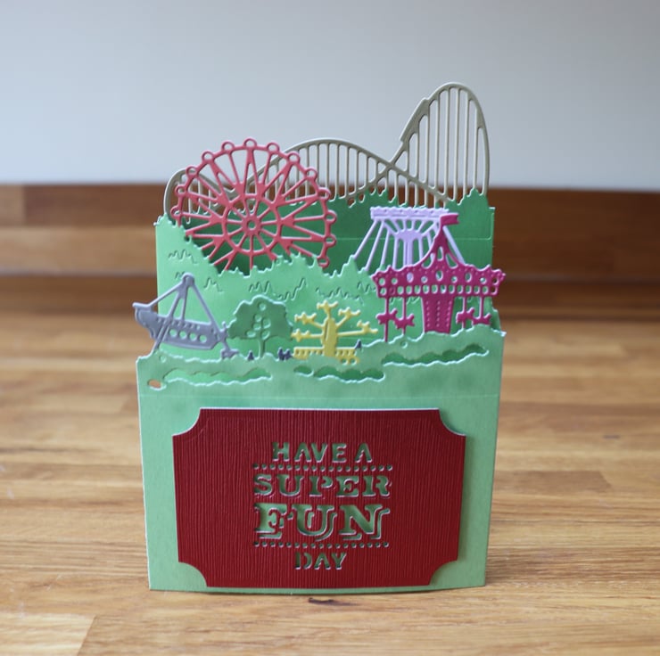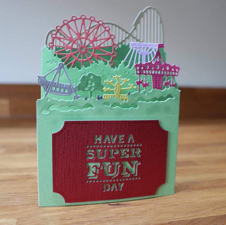 This Designs depicts all the rides of a fair ground, and the sentiment is Have a super fun day cut out of red card, great card for children.