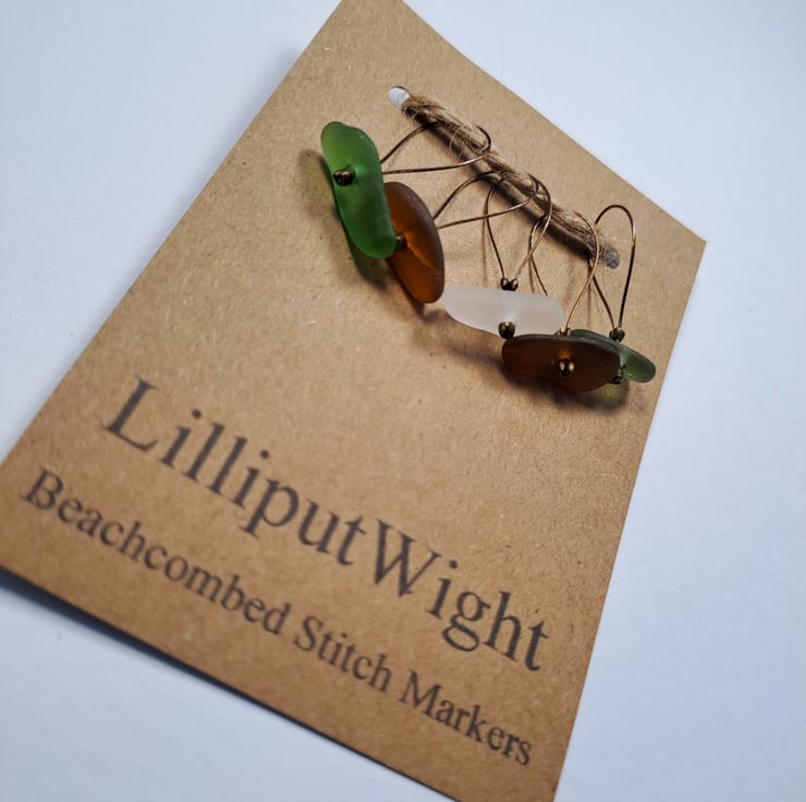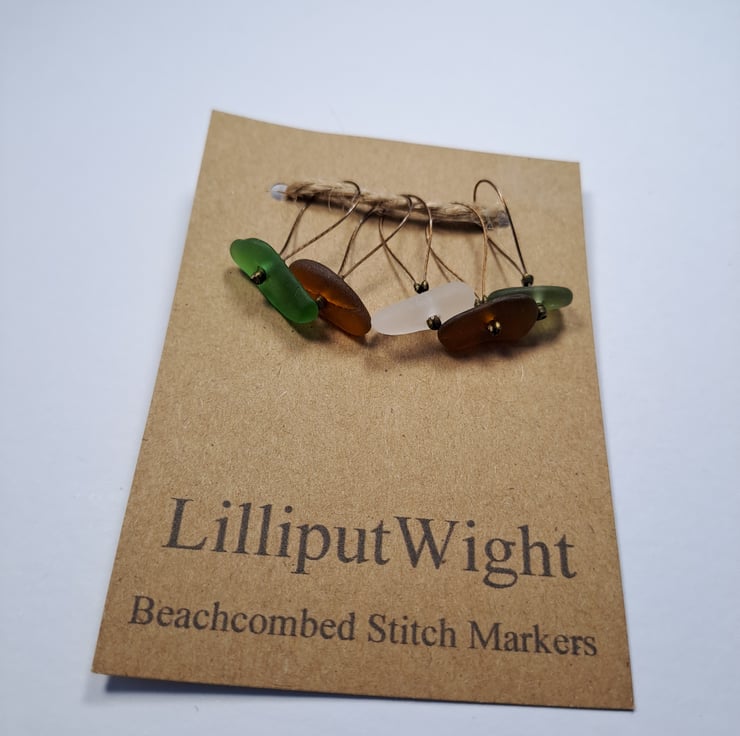 A set of five sea glass stitch markers in shades of green, brown and clear. The sea glass is all genuine and has been collected from beaches close to my home on the Isle of Wight.