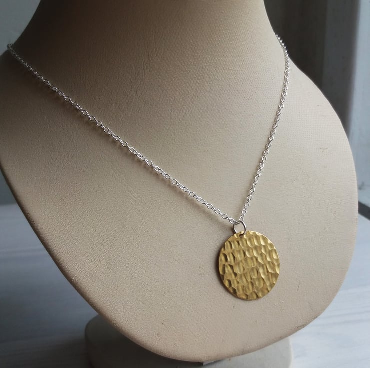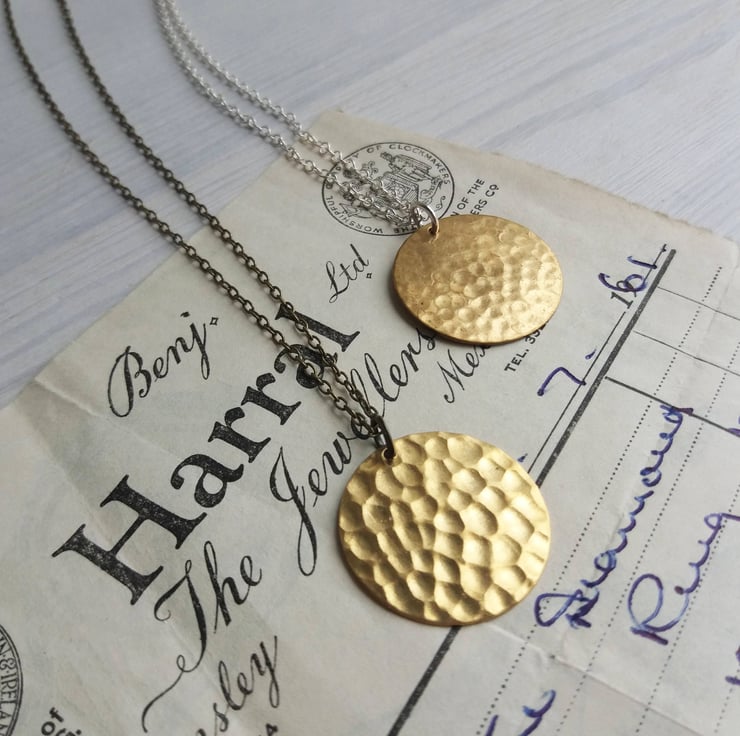 These hammered brass discs are beautifully textured. Hung simply on fine bronze or silver plated chain.