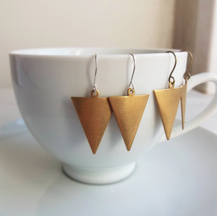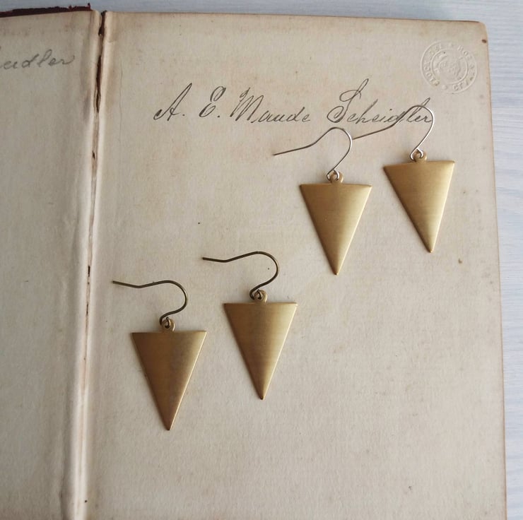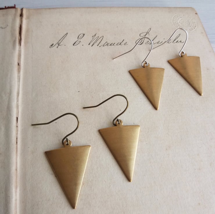 Raw Brass Triangles earrings - golden brass arrows with bronze - geometric