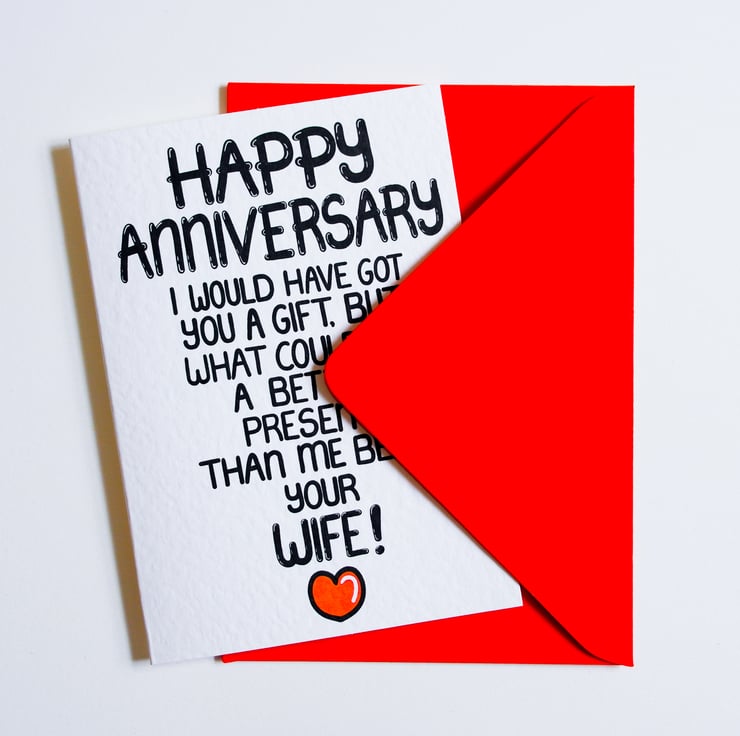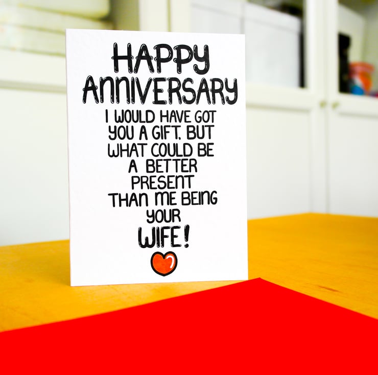 Greeting on front: HAPPY ANNIVERSARY I WOULD HAVE GOT YOU A GIFT, BUT WHAT COULD BE A BETTER PRESENT THAN ME BEING YOUR WIFE!