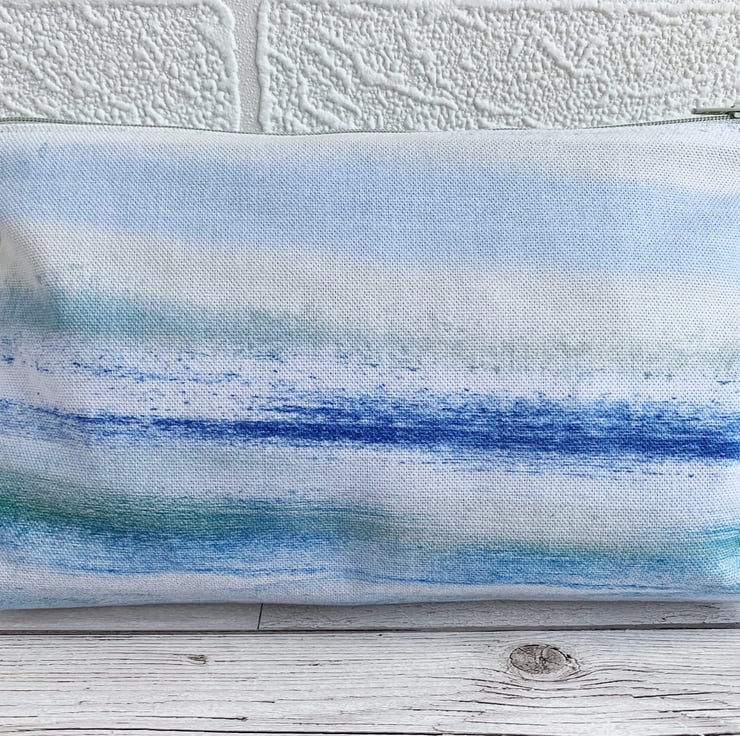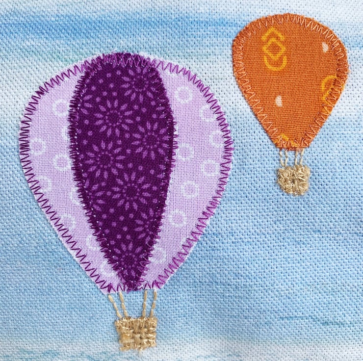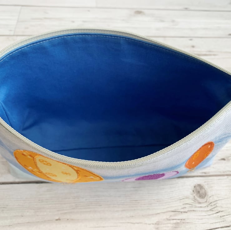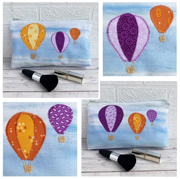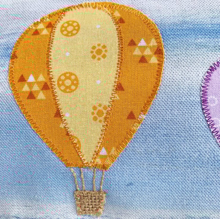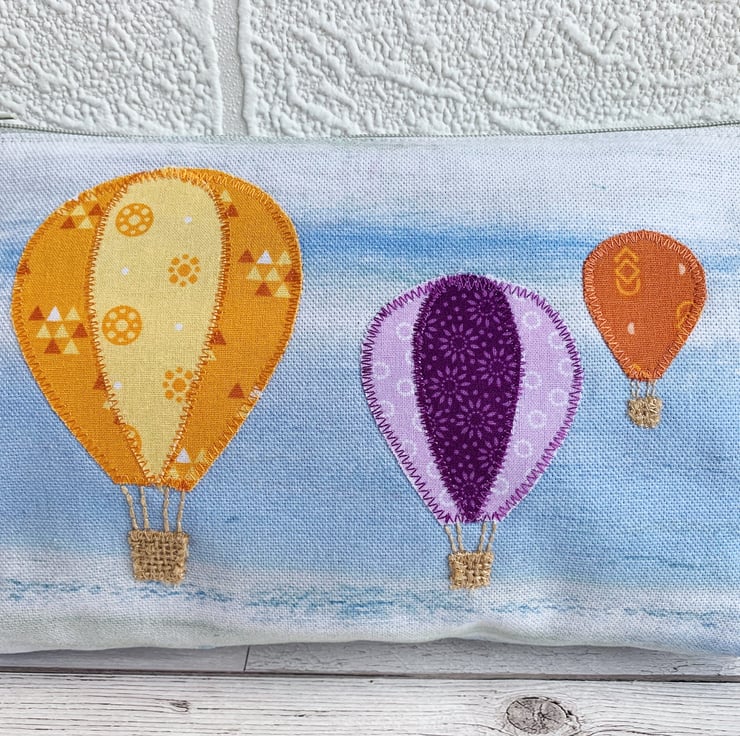 Large make up bag with yellow and purple hot air balloons. This large sized cosmetic bag is made from a lovely pale blue print fabric which resembles a cloud-streaked sky. I've added three appliqué hot air balloons in varying sizes. The balloons are made from matching print fabrics, and consist of a large orange and yellow balloon, a medium lilac and purple balloon, and a small terracotta balloon. I've used hessian for the baskets and I've hand-embroidered the ropes attaching the baskets to the balloons. The make up bag fastens with a pale grey zip and is lined with lovely bright blue fabric.