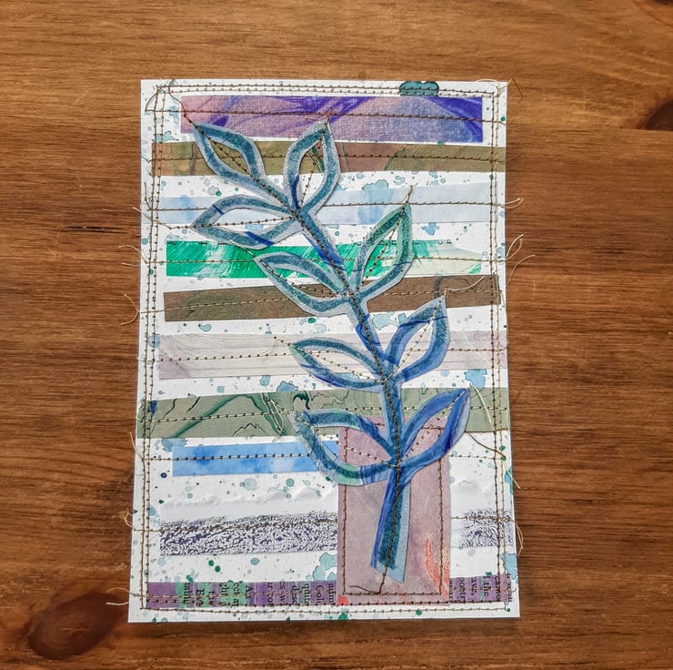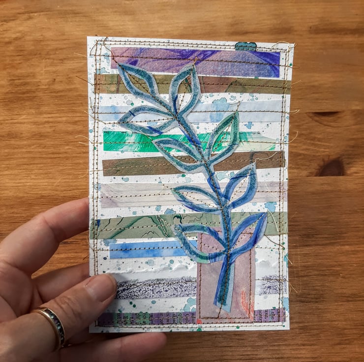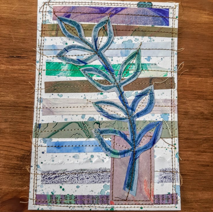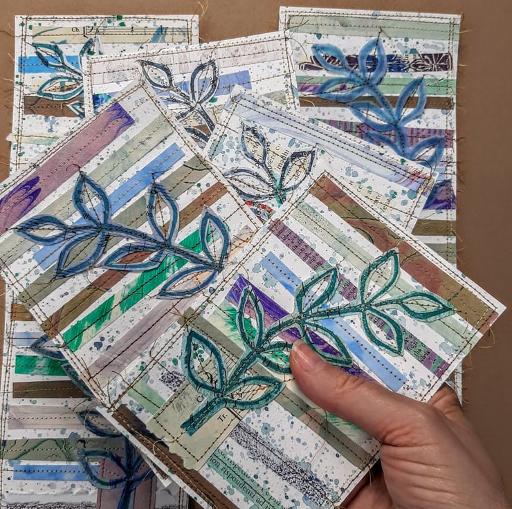 This leaf motif paper collage is a collection of paper snippets used for other projects sewn onto a watercolour paper background and features a gorgeous printed leaf motif.