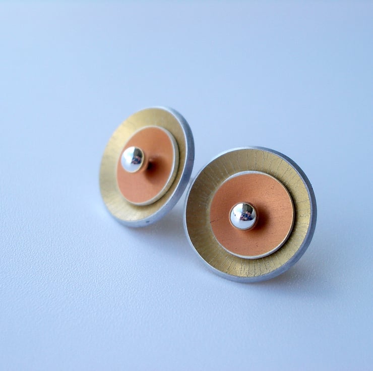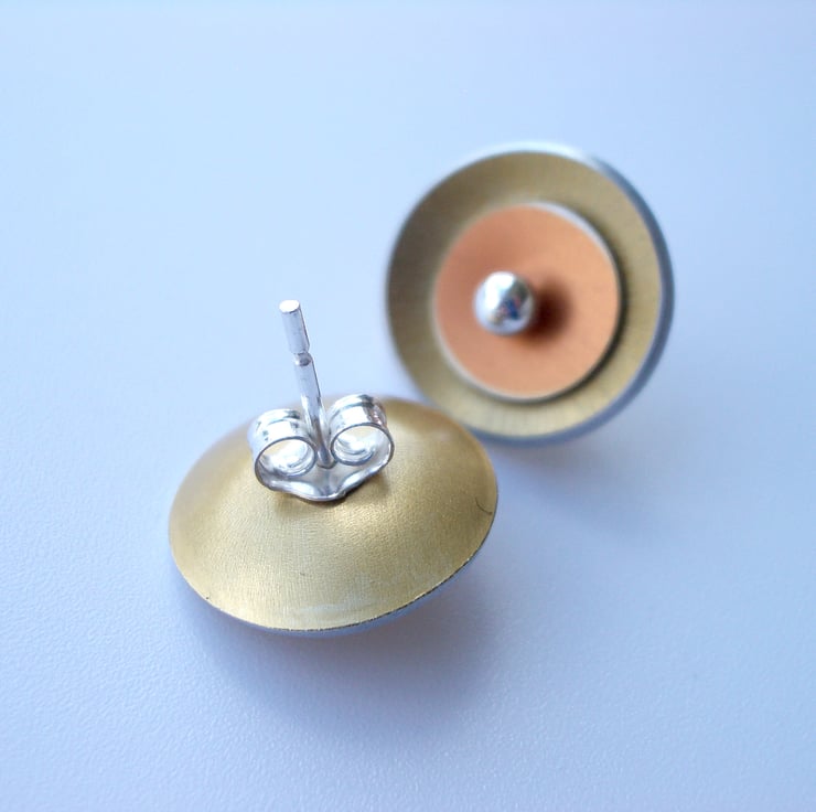 These circle earrings are made from aluminium which I have dyed in rich orange and gold colours. I then seal the dye in so that it becomes a permanent part of the metal. Each circle is cut out by hand using a piercing saw and then domed so that they catch the light. As aluminium can't be soldered, they are fed onto a sterling silver ear post, when worn the pressure from the butterflies at the back hold the two circles in place.