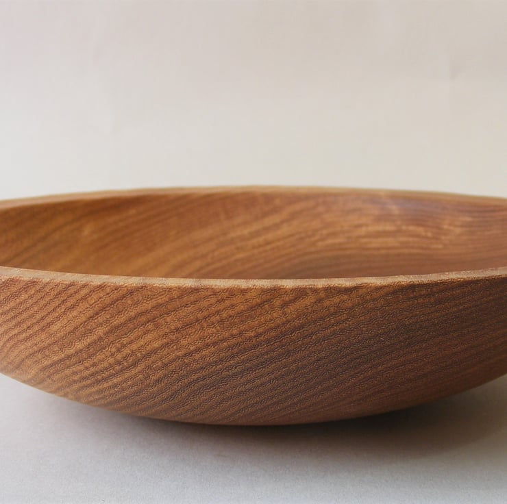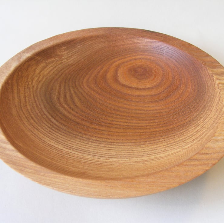Elm food bowl, 200 x 46mm, finished in food safe oil. A striking piece of Elm, turned into a gentle curve that really shows off the grain and colour of the wood, it has a flat rim with a slight dip to it. It would make a lovely decoration or could be used to hold food items.
