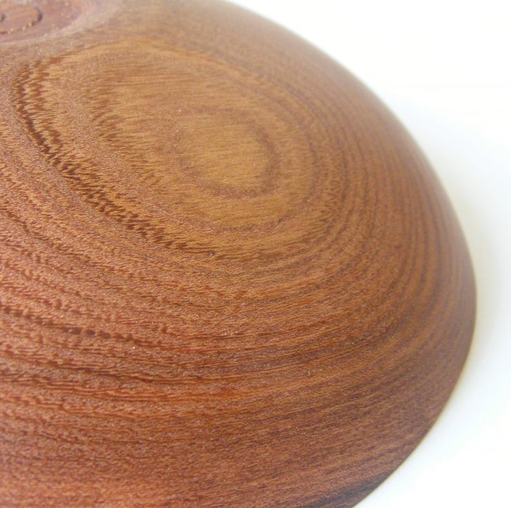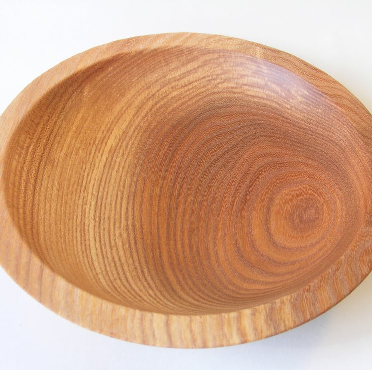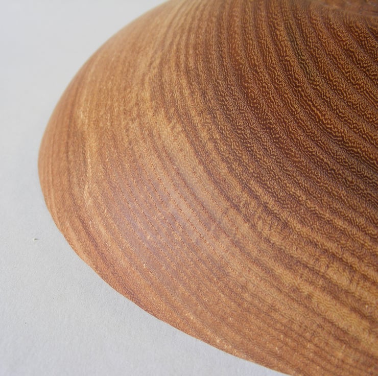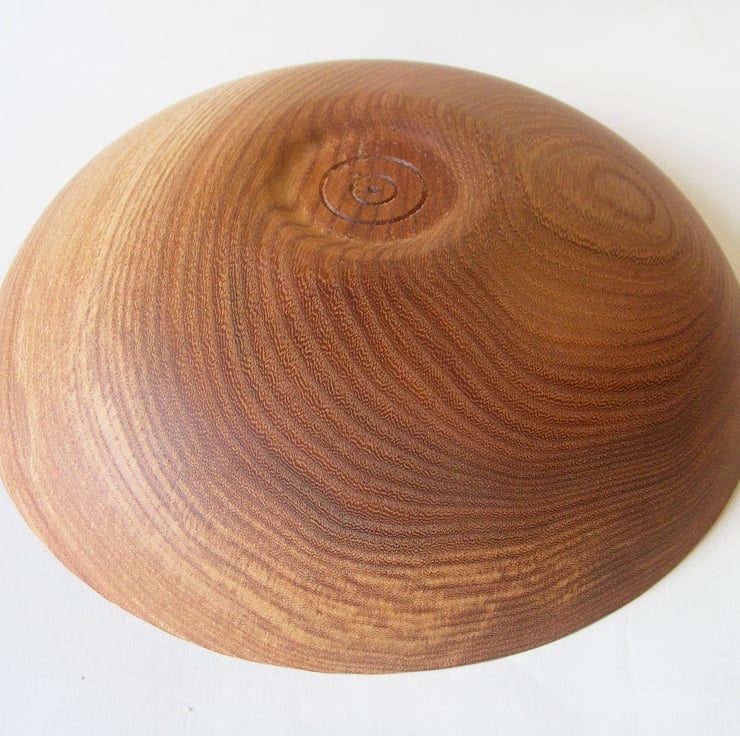 A lovely bit of Elm, that like so many pieces of the wood I choose looked nothing special on the outside, but once turned, became a very striking and beautiful piece that shows off stunning grain patterns and colours. It would make a nice decoration or practical bowl for many food types.