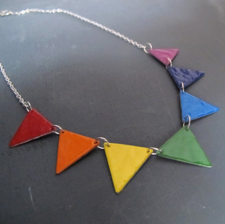 The aluminum triangle flags have been enameled in the bright colours of the rainbow. Each bunting flag is connected with a silver plated jump ring to create a row of bunting. The flags are joined to a 16" silver plated chain.