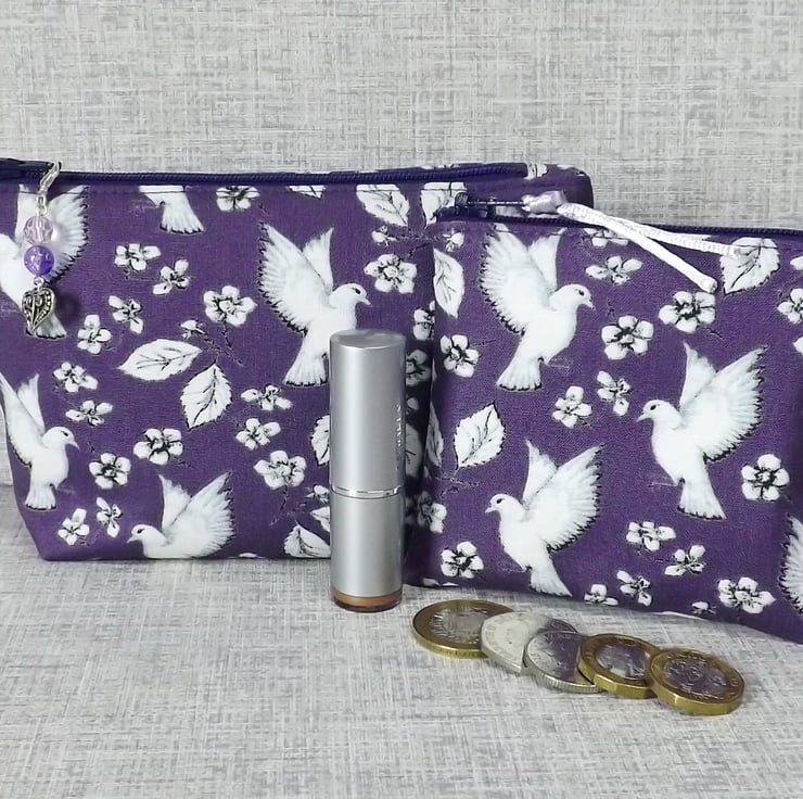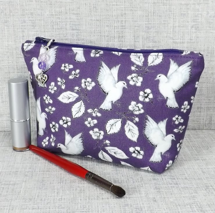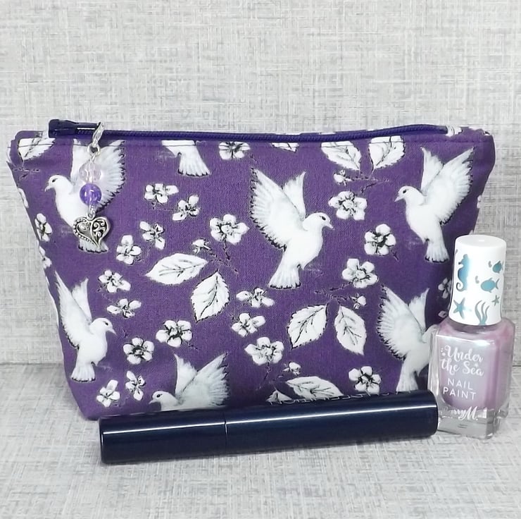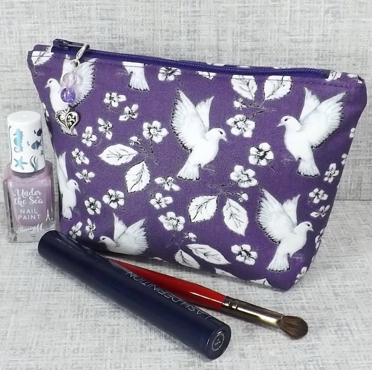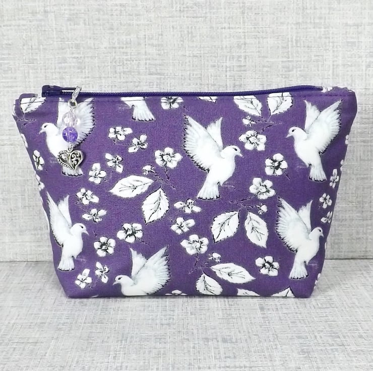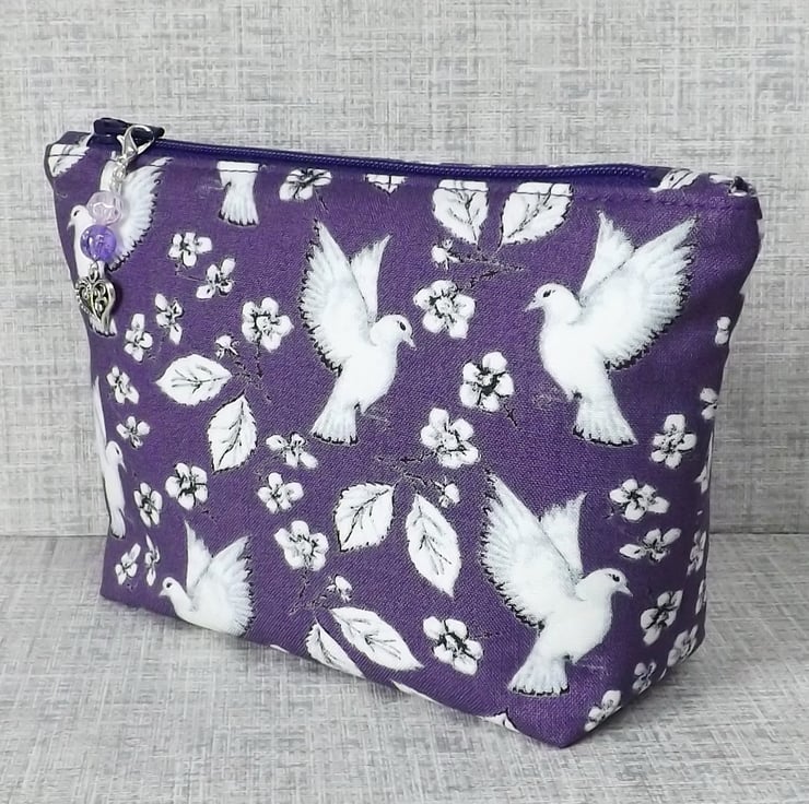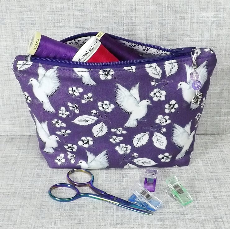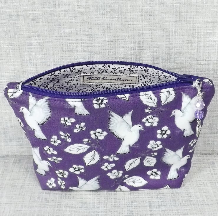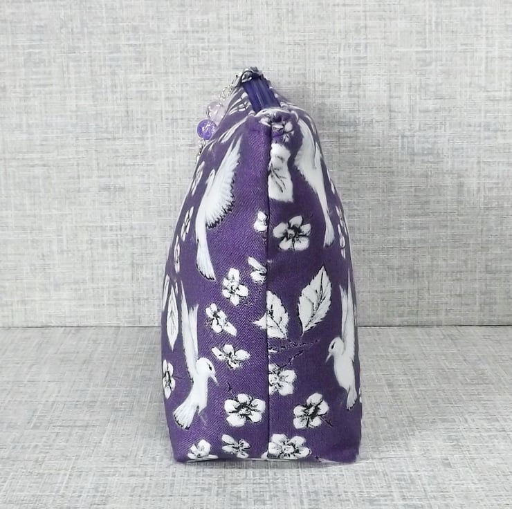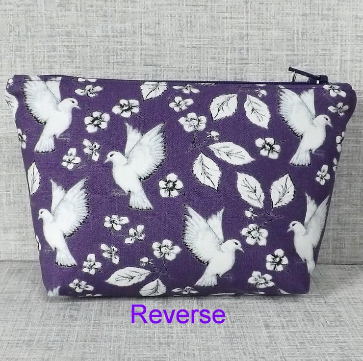 The main fabric has a bird & flower design in white, on a purple background. The lining is a co-ordinating cotton fabric in white & purple.