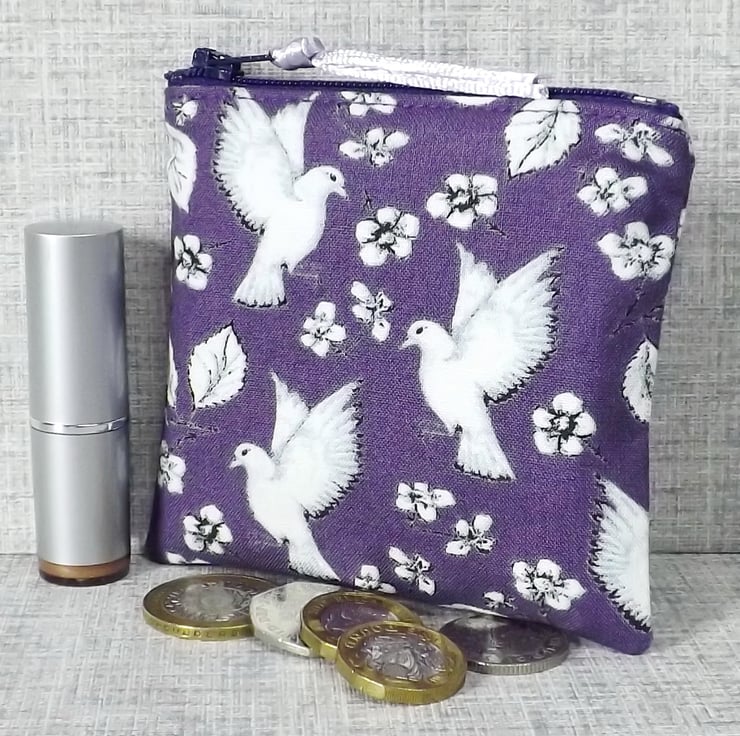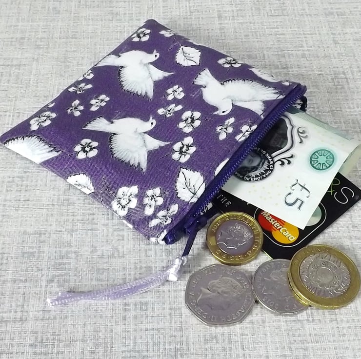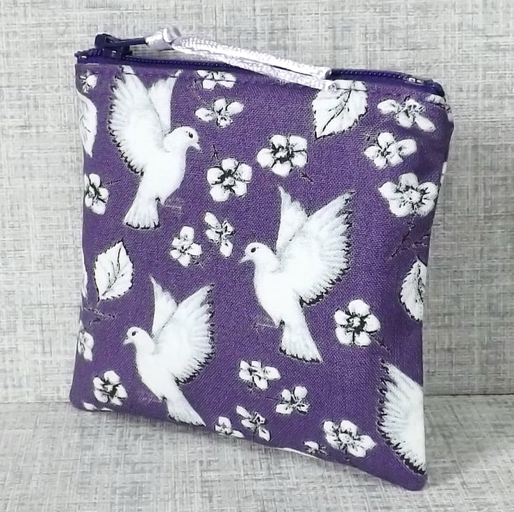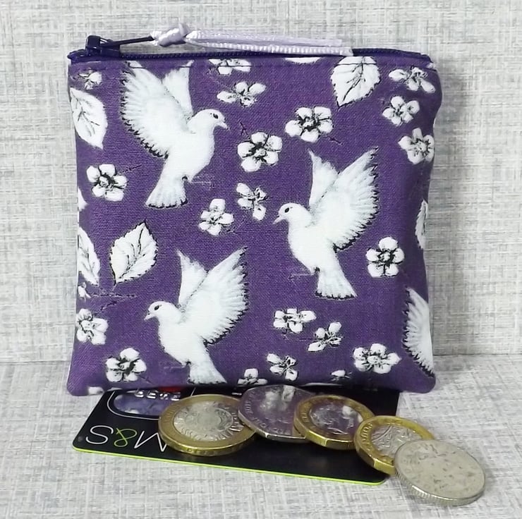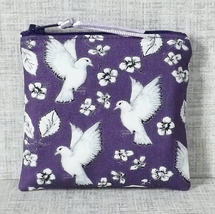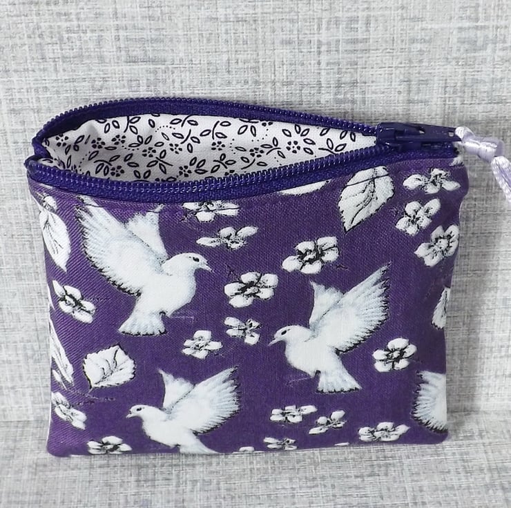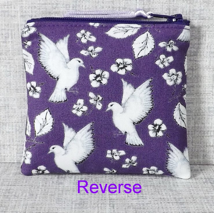 The main fabric has a bird & flower design in white, on a purple background. The lining is a co-ordinating cotton fabric in white & purple.