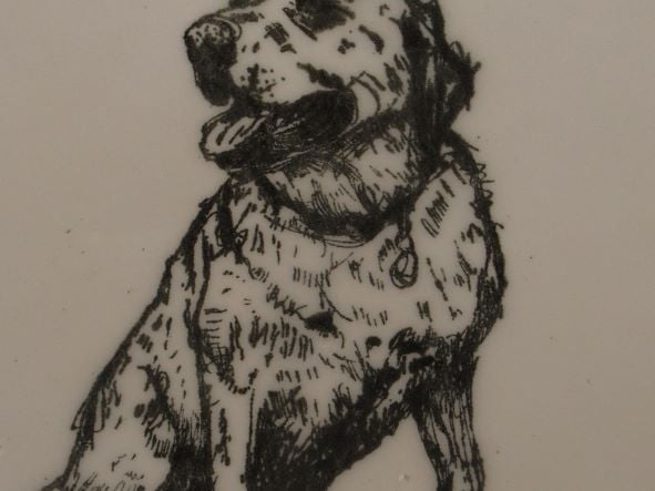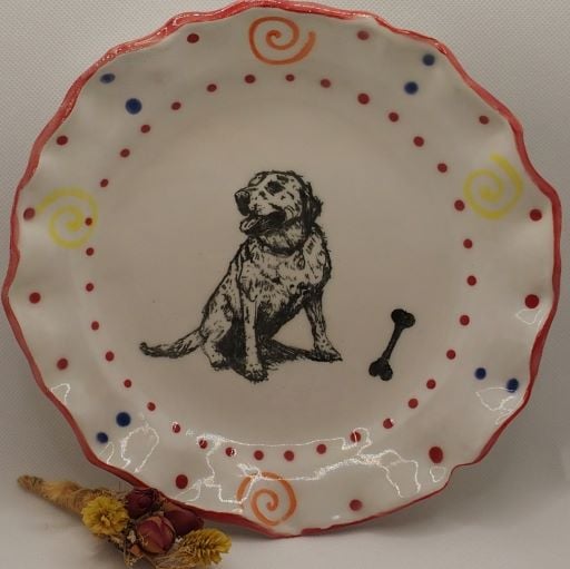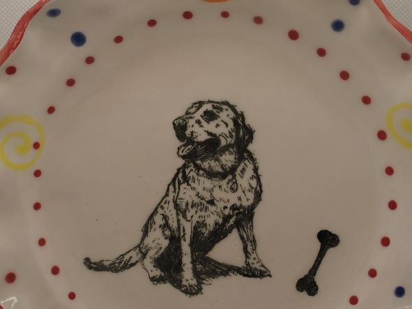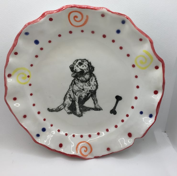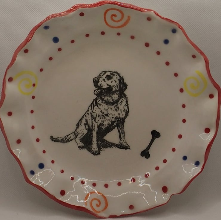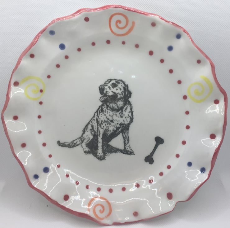 The plate is formed from a slab of stoneware clay. Once dry it was painted with white underglaze and the image of the dog is created using a silk screen. Colourful patterns and dots added for decoration. The plate is then bisque fired and then glaze fired with a transparent food safe glaze.