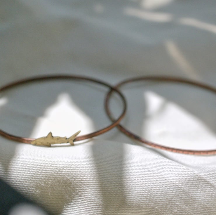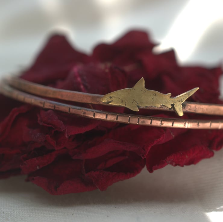 Bangle 1 - Handmade copper bangle with hand engraved great white shark in reclaimed brass.