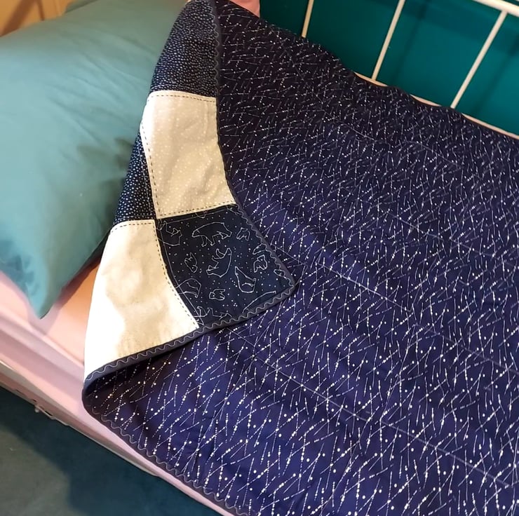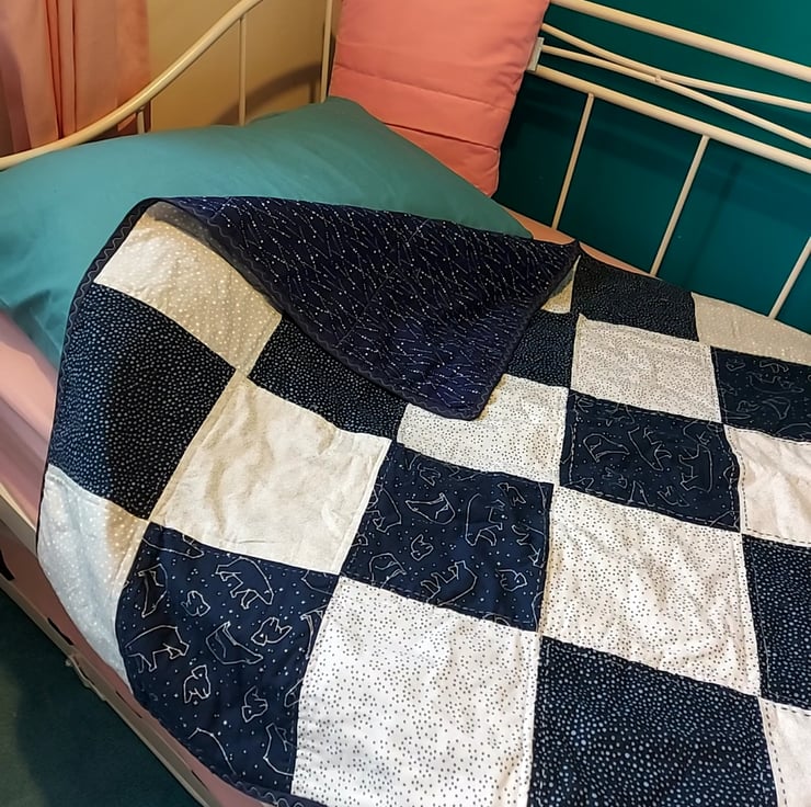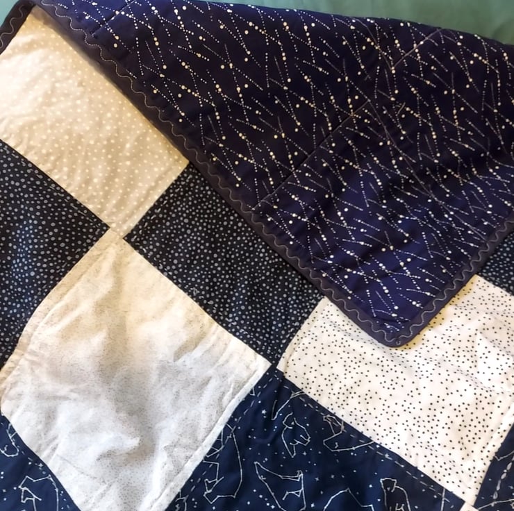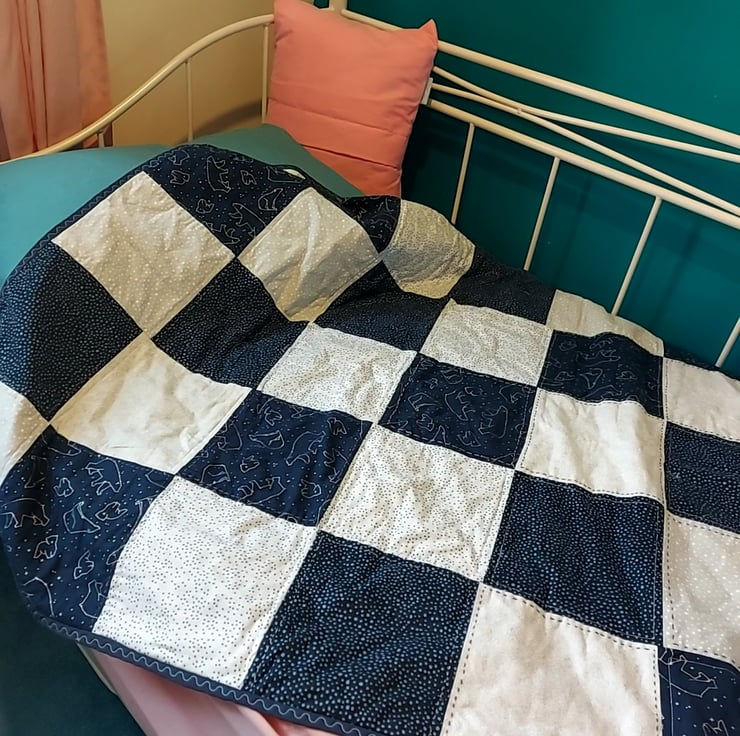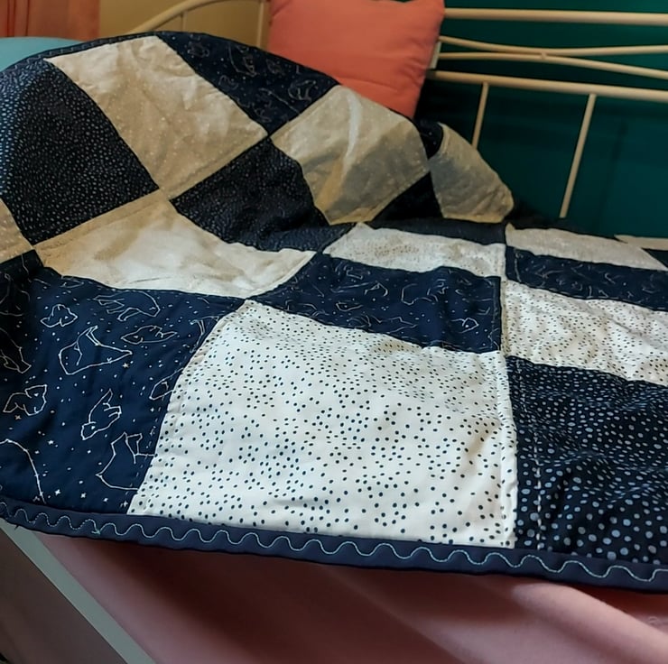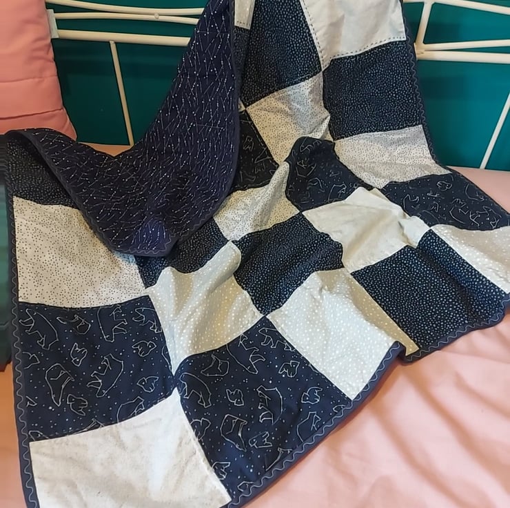 this sweet baby quilt made up in a simple block pattern of alternating dark and light squares there are 3 light patterns a pale grey and white star a white with navy dots and a white with silver dots and the dark are navy with a lighter blue dot and navy with the most beautiful star bare print , i have both machine quilted and hand quilted this to add texture and to hold the layers together