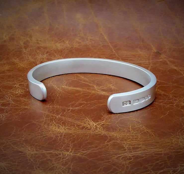 This gents open Heavy Bangle is Solid Sterling Silver with makers mark DL and a full set of London Assay Office Hallmarks.