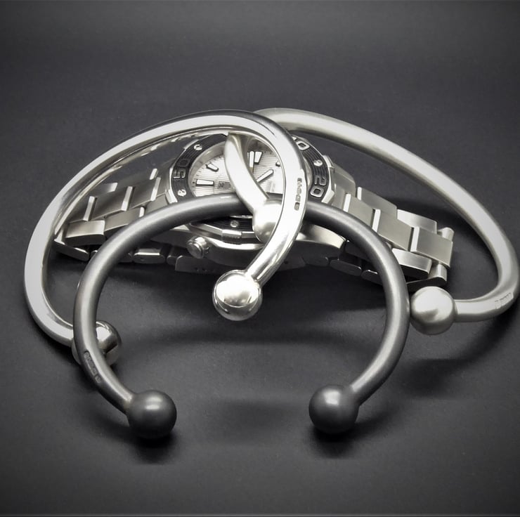 This gents open Bangle is Solid Sterling Silver with makers mark DL and a full set of London Assay Office Hallmarks.