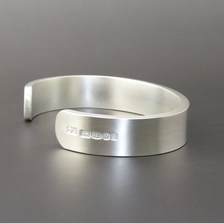 This gents open extra Heavy Bangle is Solid Sterling Silver with makers mark D L Daryl Locke, and a full set of London Assay Office Hallmarks.