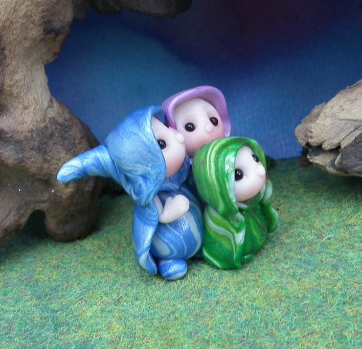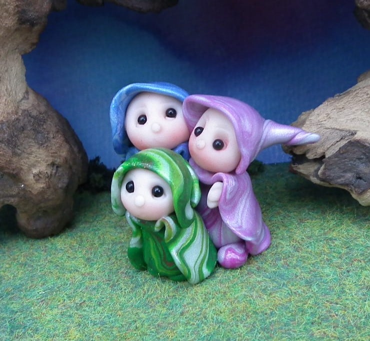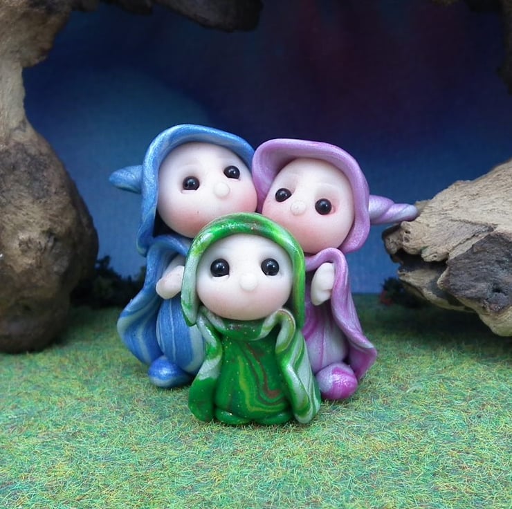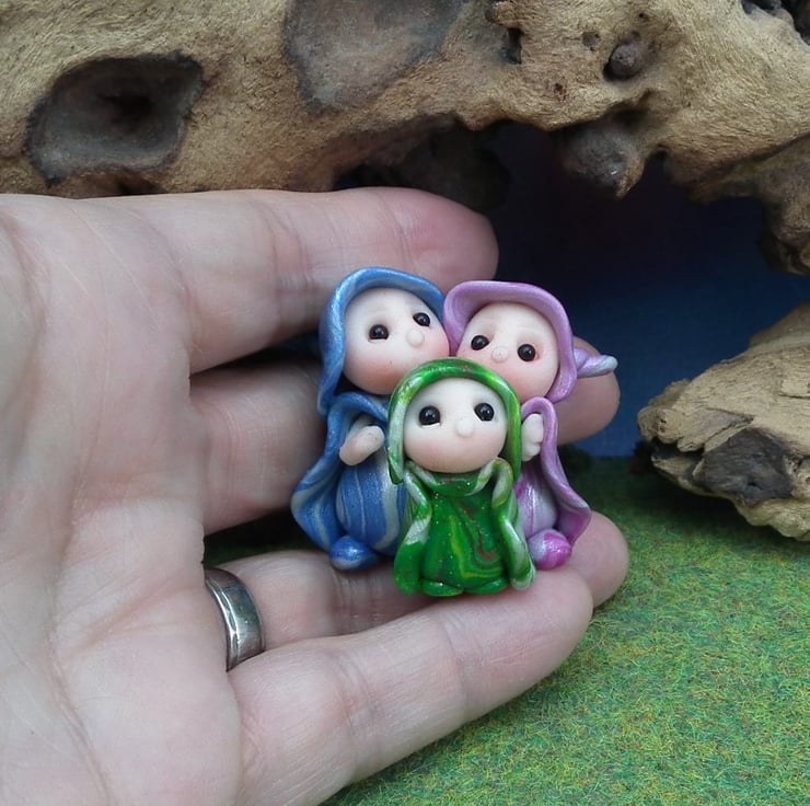 This is a 'one of a kind' creation having been entirely handmade without the use of moulds here at my studio on the Sussex Coast. Modelled with my own blended polymers, painted with heat set paints before sealing with lacquer, all three Gnomes have sparkling black onyx eyes. Just one and a half inches high, the Gnomes are fixed as a group so cannot be separated.