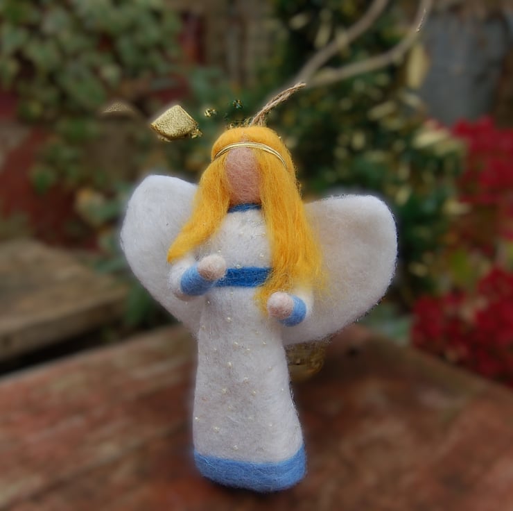 She has been lovingly created in wool using the needle felt method. Her white dress, wings and heart have silver sparkly threads running through the wool fibre. I have hand sewn white beads to the front of her dress to represent snow flakes.