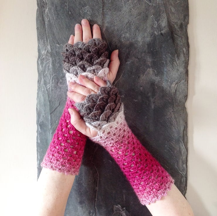 Hand crocheted in a soft and beautiful wool blend, this is a pair of gorgeous mid length Dragon Scale Gloves.