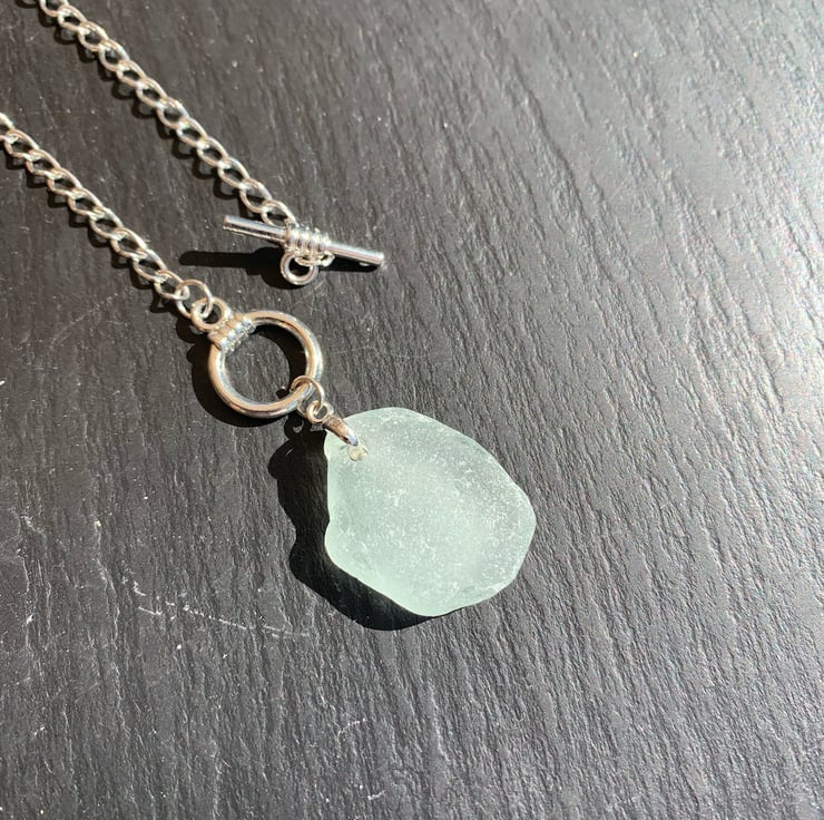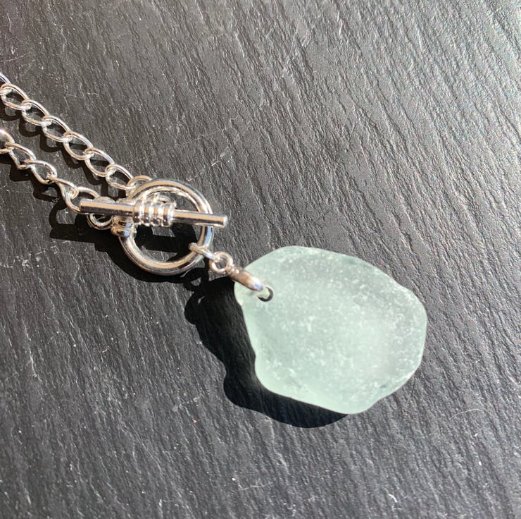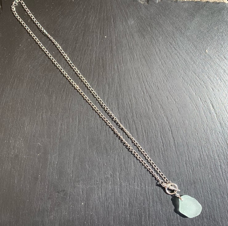 This piece of blue-green seaglass was collected from Withernsea beach. It has a silver plate mount enabling it to be worn with either side of the seaglass showing. As always with seaglass, this is a unique piece of jewellery. The seaglass drop is secured to a loop on one end of the 22inch chain. A 2cm bar is fitted to the other end of the chain. The necklace is secured at the front of the body by passing the bar through the loop.