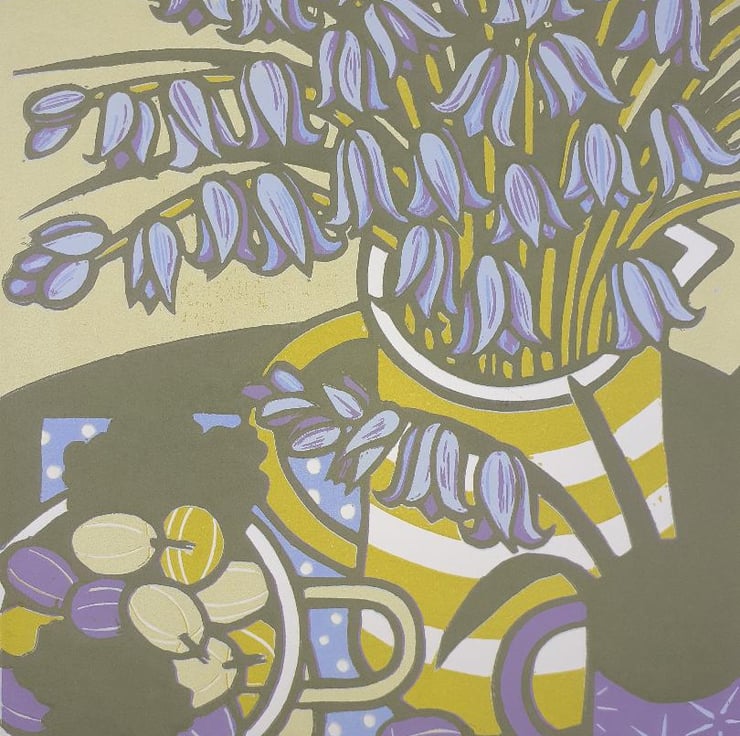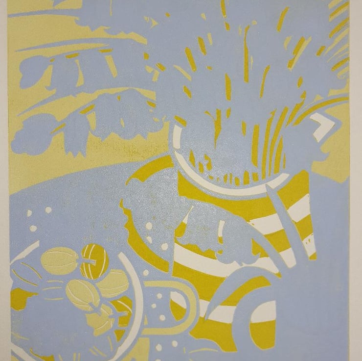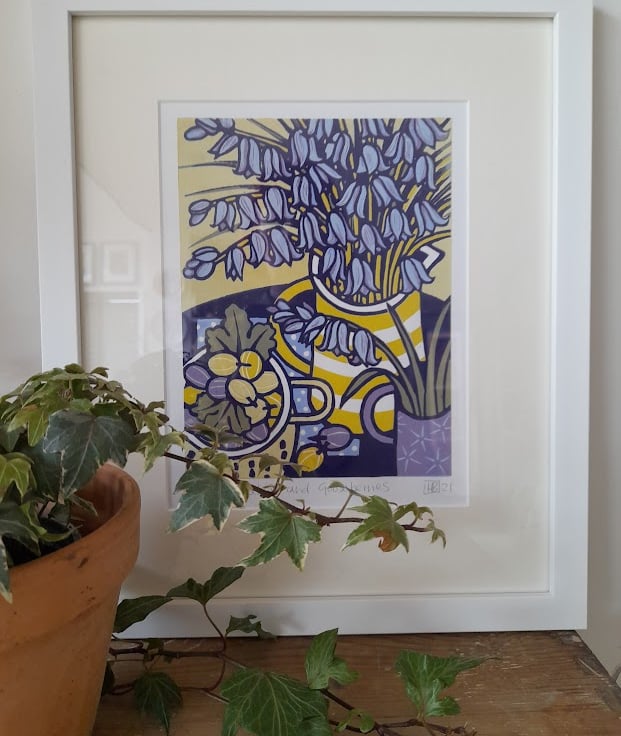 I use the reduction printmaking method in which the printable area of the lino is gradually cut away as each colour is printed and by the end there is no printable surface left. This is why the prints are limited editions as it is not possible to print any more. This is printed in 7 colours.