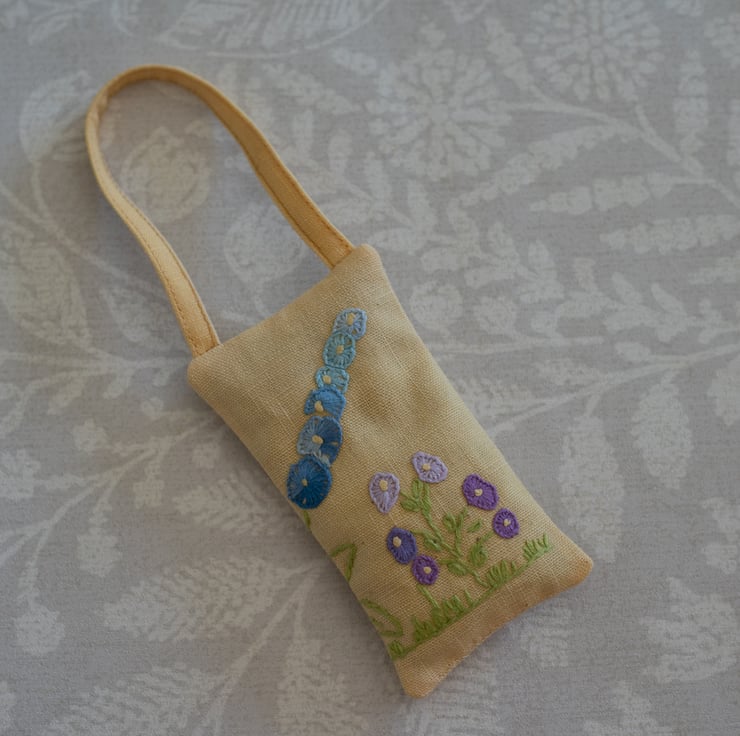 This pretty little hanging lavender bag is made from beautiful quality vintage embroidered linen and filled with Yorkshire lavender. The embroidered flowers give a feel of a cottage garden.