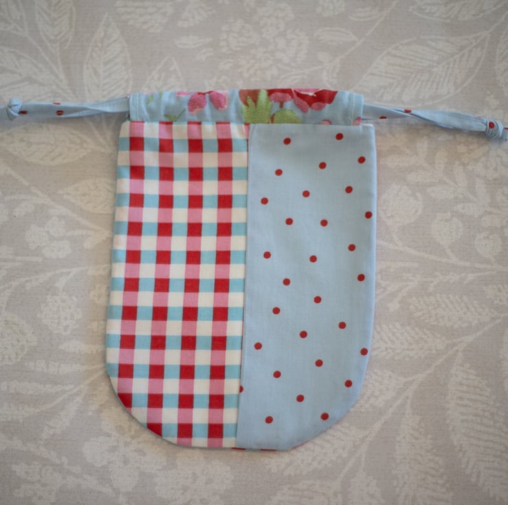 This pretty drawstring bag made from Cath Kidson/IKEA Rosali fabrics in spots, flowers and checks. It can be used for storage or even as a grift bag.