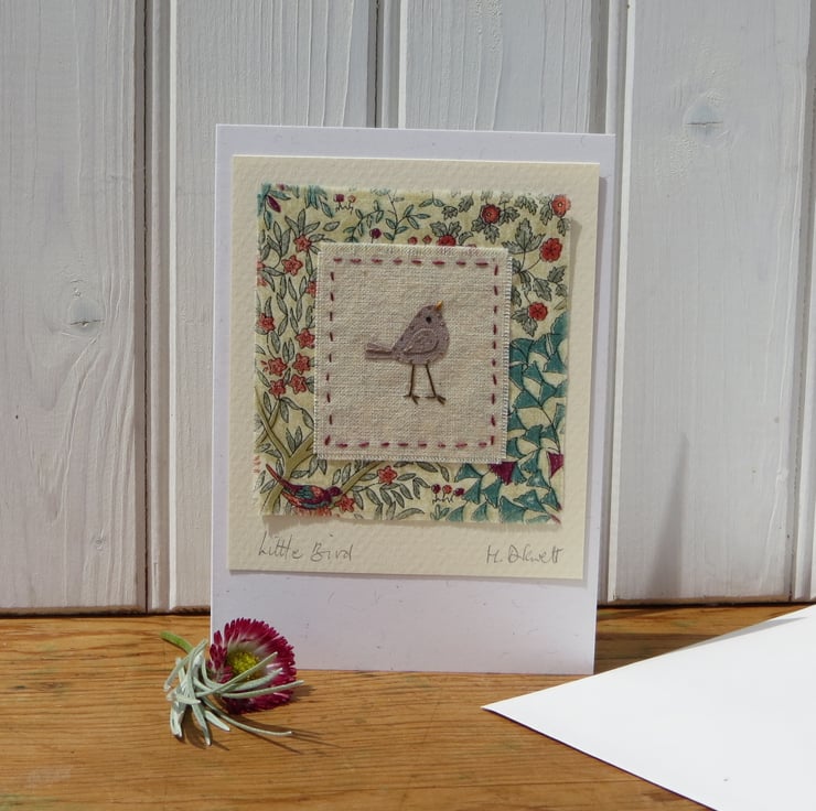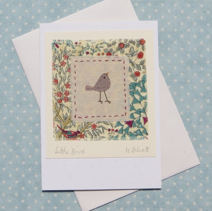 A unique hand-stitched miniature applique with embroidered details. The little bird is cut from my own hand-dyed recycled cotton fabric, the central panel is stitched to a pretty Liberty cotton print fabric. Perfect for any number of occasions - a card to keep.