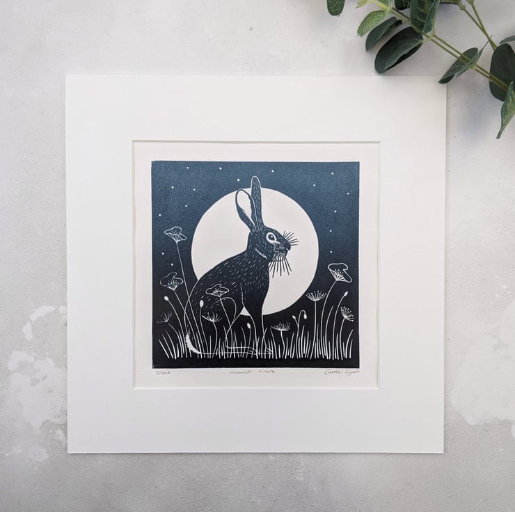Moonlit Hare Linocut Print, Moon Gazing Hare