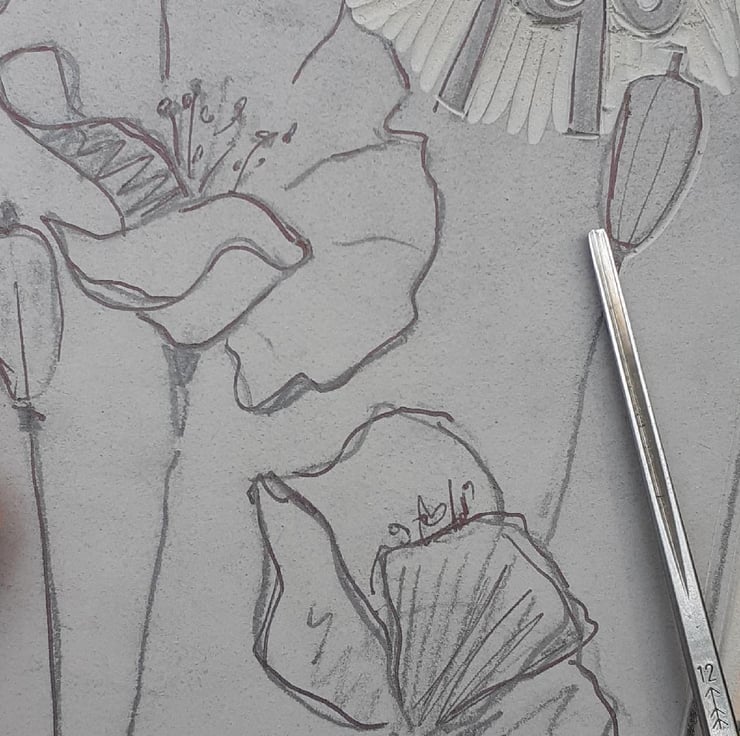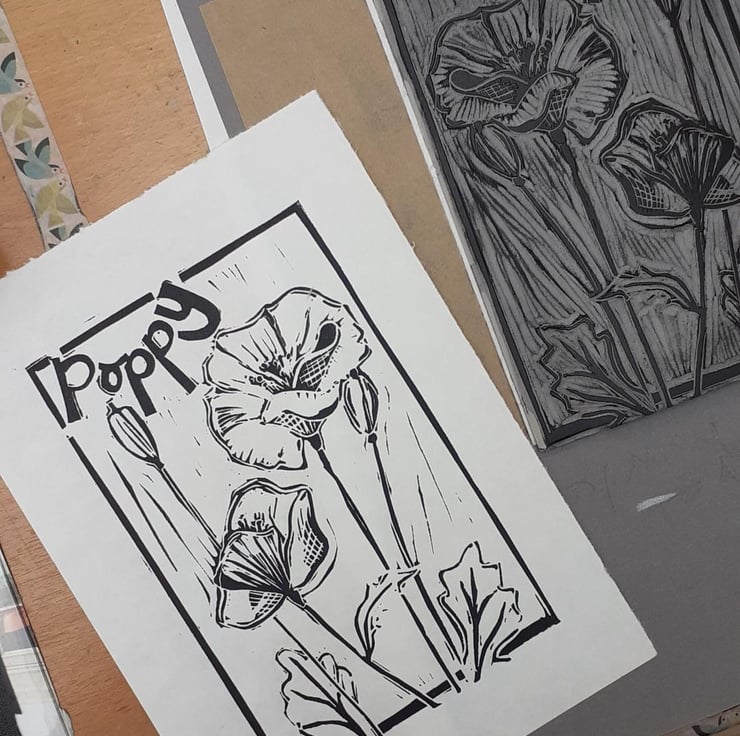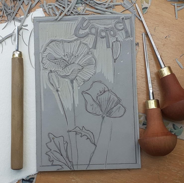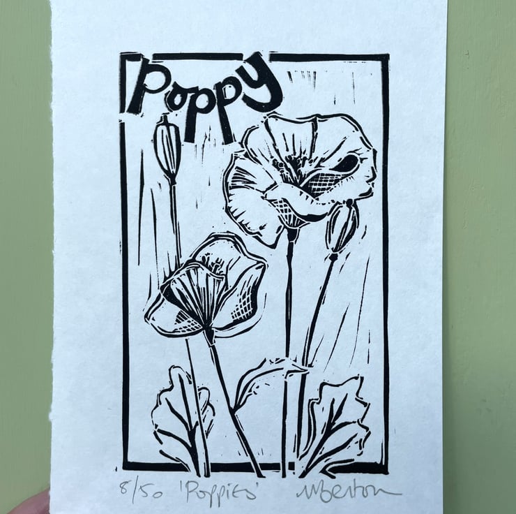 I took some of the sketches made of our beautiful Welsh poppies and transferred them onto a traditional hessian backed lino which I then hand cut and burnished onto a lovely Japanese Hosho paper. The paper measures approx. 14cm x 20cm with the printed image itself at 10cm x 15cm approx.