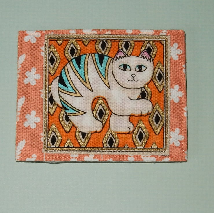This would make a lovely gift for cat lovers, a hand made wallet, ideal for travel cards, Oyster cards, bus pass or even credit cards. It measures approx. 3.5 x 3 inches folded and 7.5 inches open. It is made from a pretty cotton fabric, with an applique picture of a Japanese style "waving cat", it is lined in toning fabric.