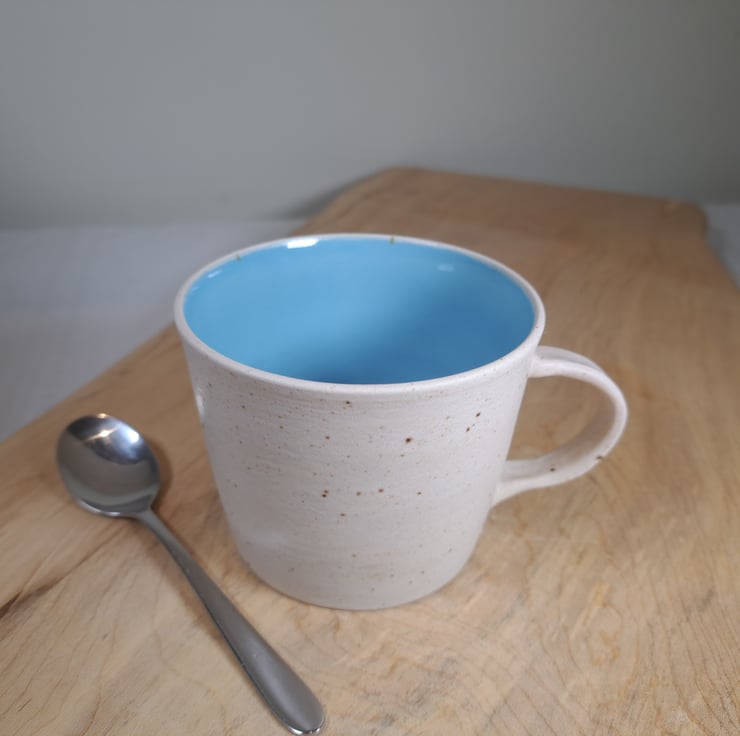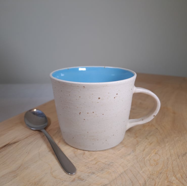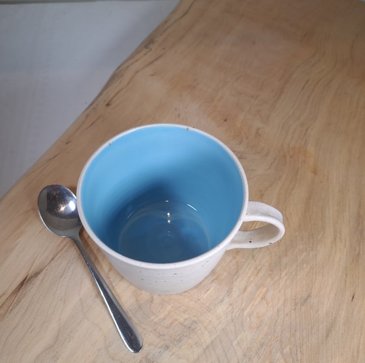 This is a hand thrown stoneware mug with a glossy turquoise inside and matt cream speckled outside.
