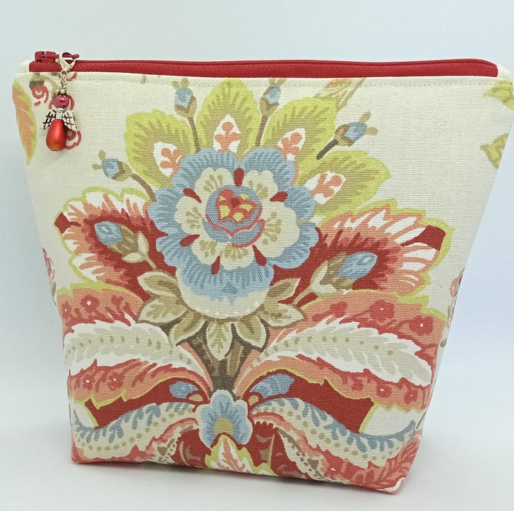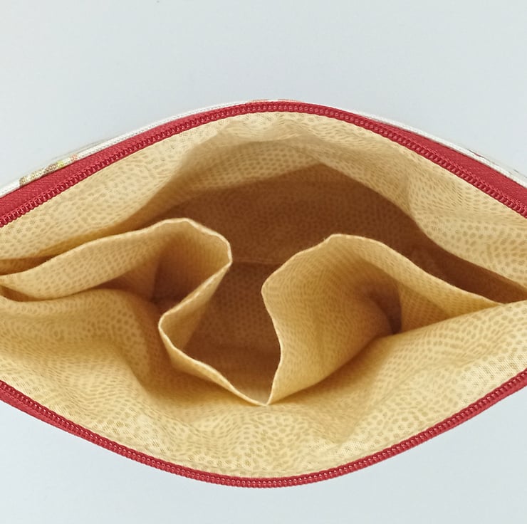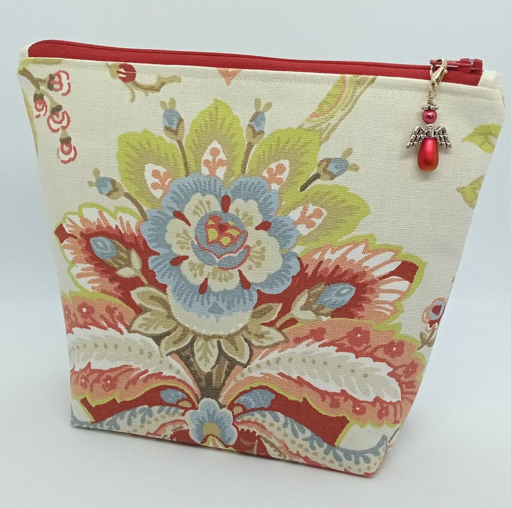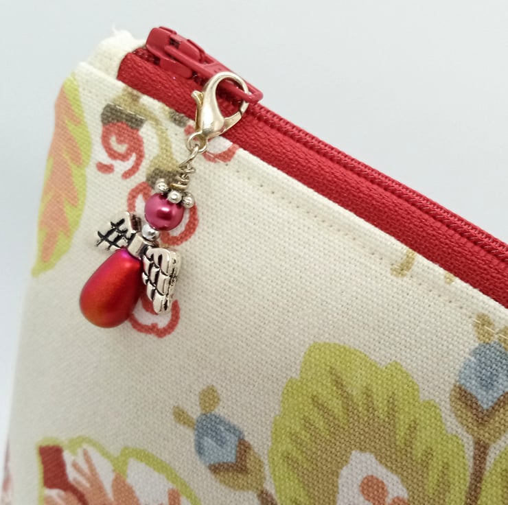 Created from sample book pages, so new fabric, it has a lovely pattern that is repeated on the back. The little angel zip pull has been created to match the colour of the zip and pattern. It is detachable.