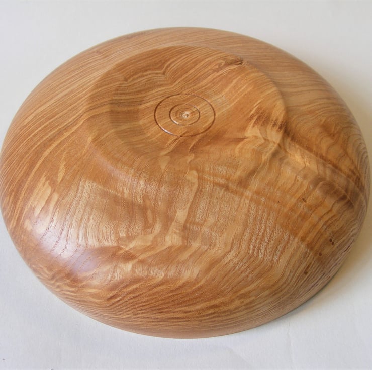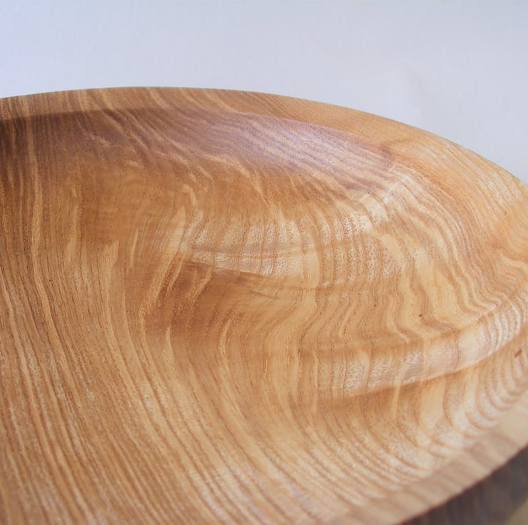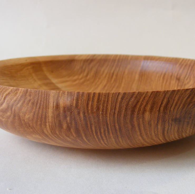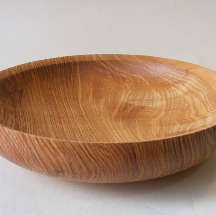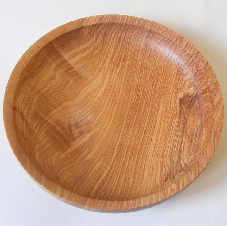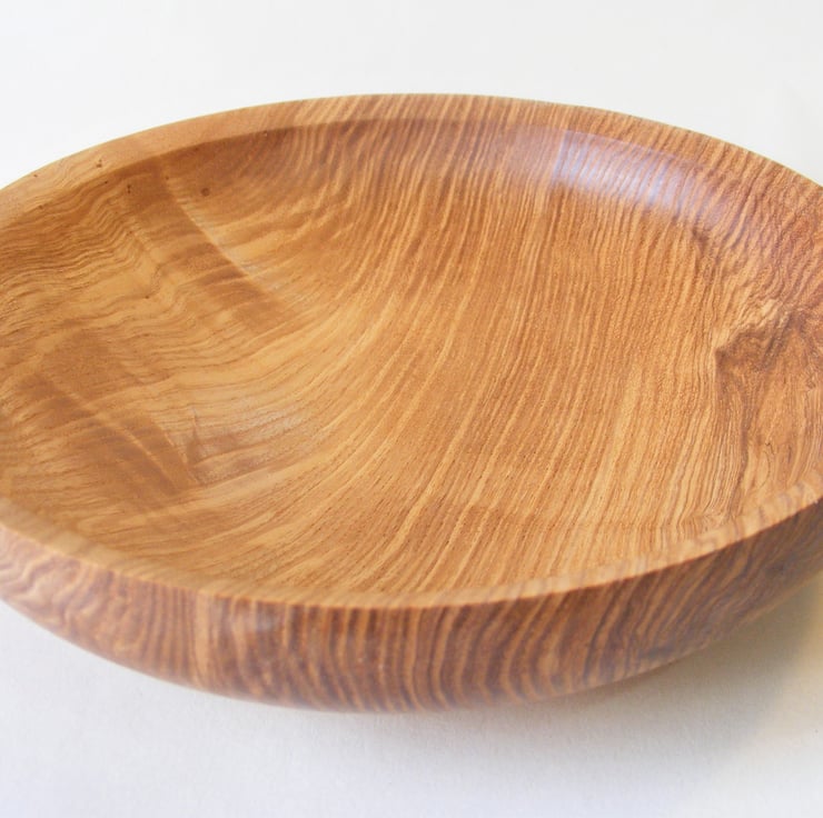 Olive Ash Bowl, 172 x 42mm, finished in Danish oil. A lovely shallow Olive Ash bowl, it has a nice curved shape and an in turned rim. The grain patterns are spectacular, swirls of chocolate brown giving way to lighter rippling on the other side. Great for a decorative piece or as storage for small items.
