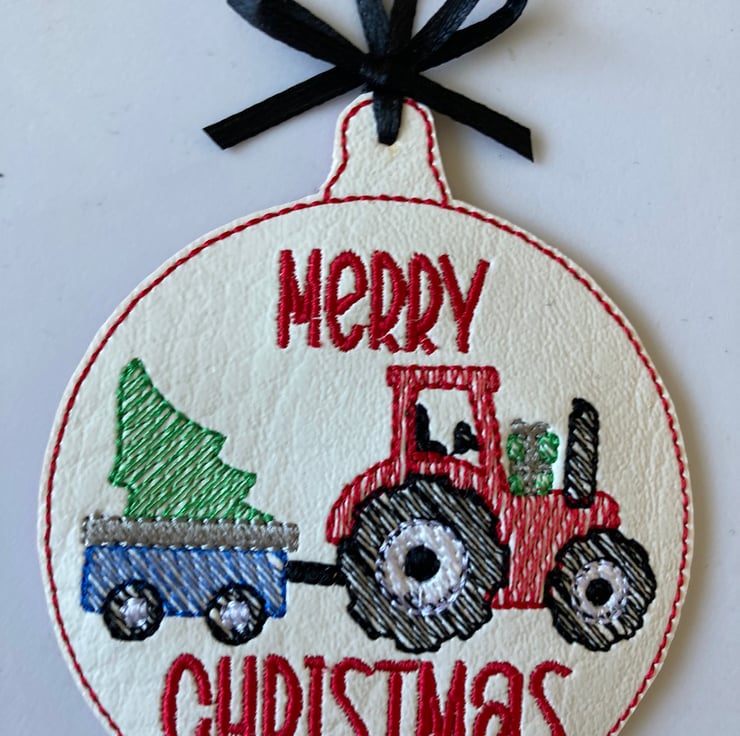 Tractor pulling tree Christmas tree hanging ornament made from vinyl and backed with felt.