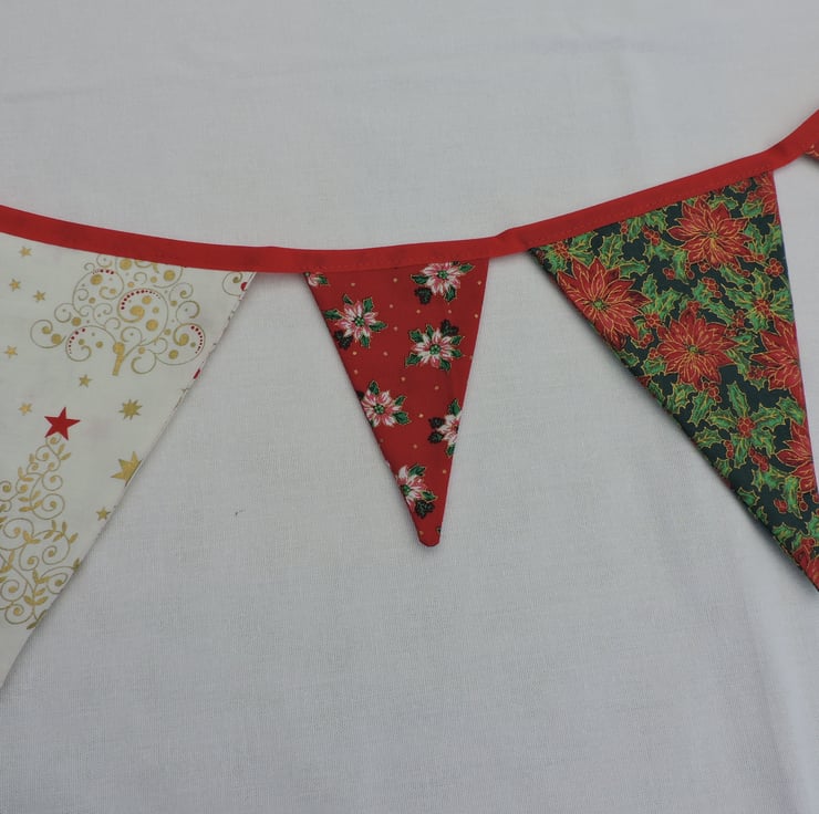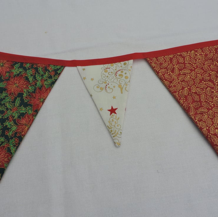 This Christmas bunting has been made with assorted leftover pieces of festive cotton fabrics. Holly leaves, poinsettia, stars and christmas trees in green, red, gold and cream . This bunting is double sided and has 17 flags in alternating sizes of 7in (18cm) by 4.5in (11.5cm) and 5in (13cm) by 3in (8cm) and is machined to red bias binding. It measures 2.82 metres plus 24in (61cm) ties at each end.