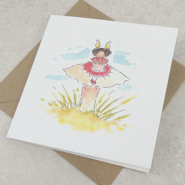 My eco friendly Fairy Toadstool card has been printed on 100% white recycled card using my original artwork and has been left blank inside for your own special message.