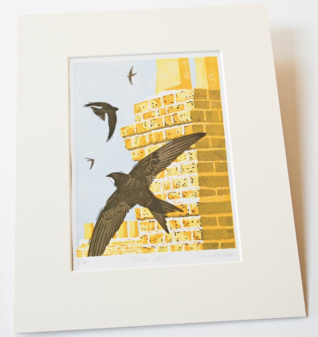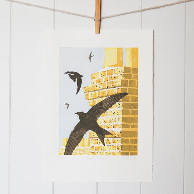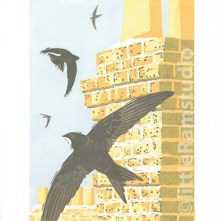 Capturing the sunny light of high Summer and the joy of watching Swifts twist and turn around the many chimney stacks of an urban landscape. The brickwork was printed using a wet into wet hand printed method which gives a unique texture to the printed image.