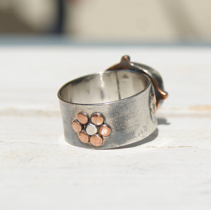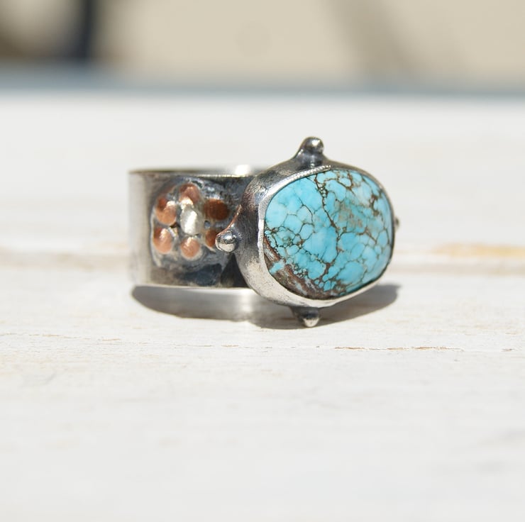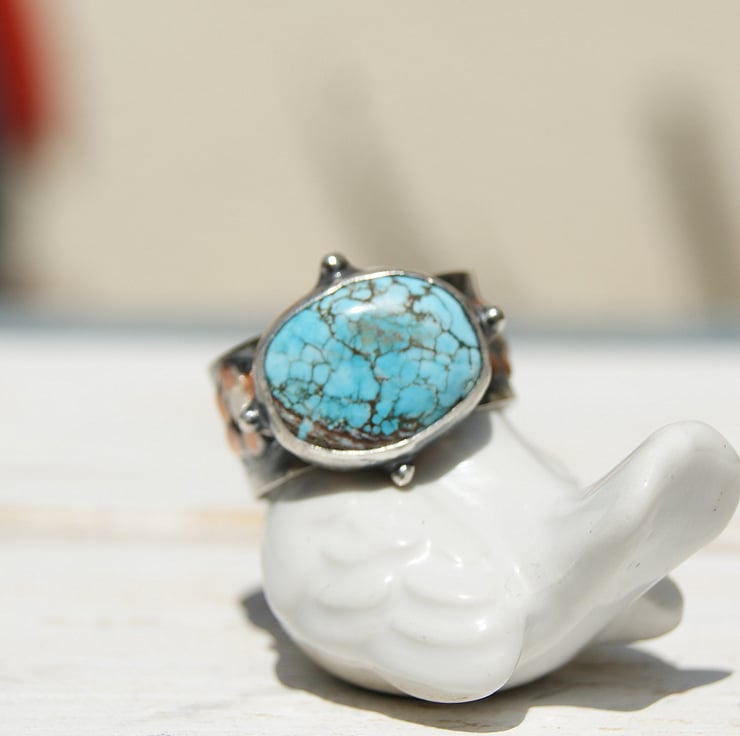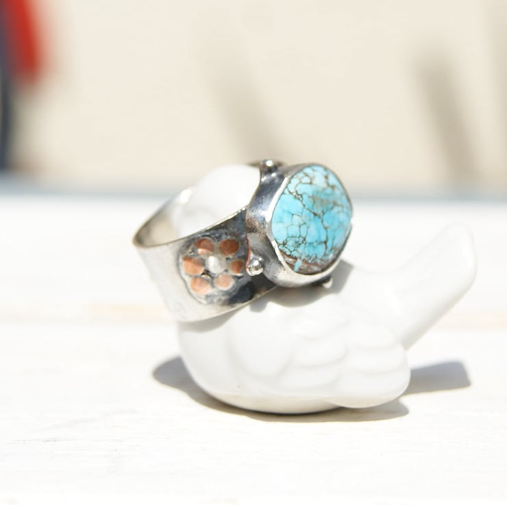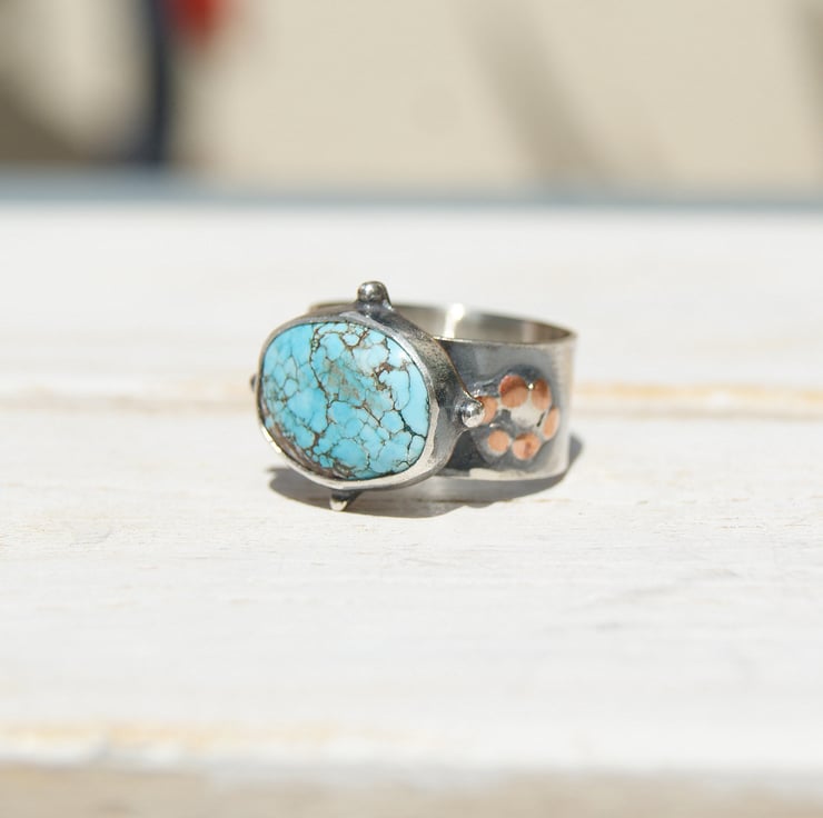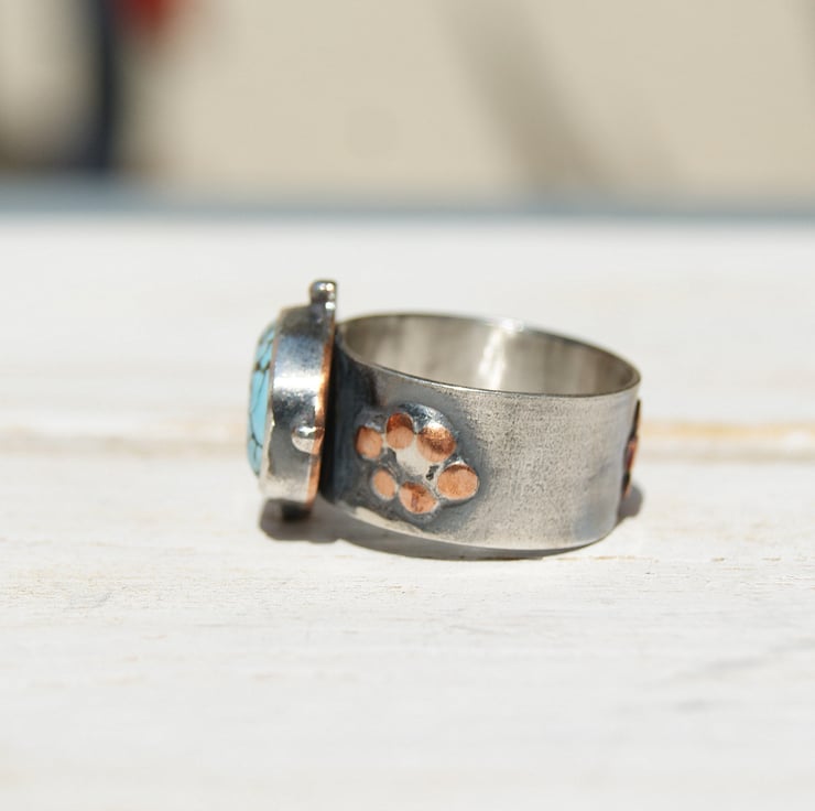 It is set in a sterling silver bezel setting with a copper backplate and sterling double band.