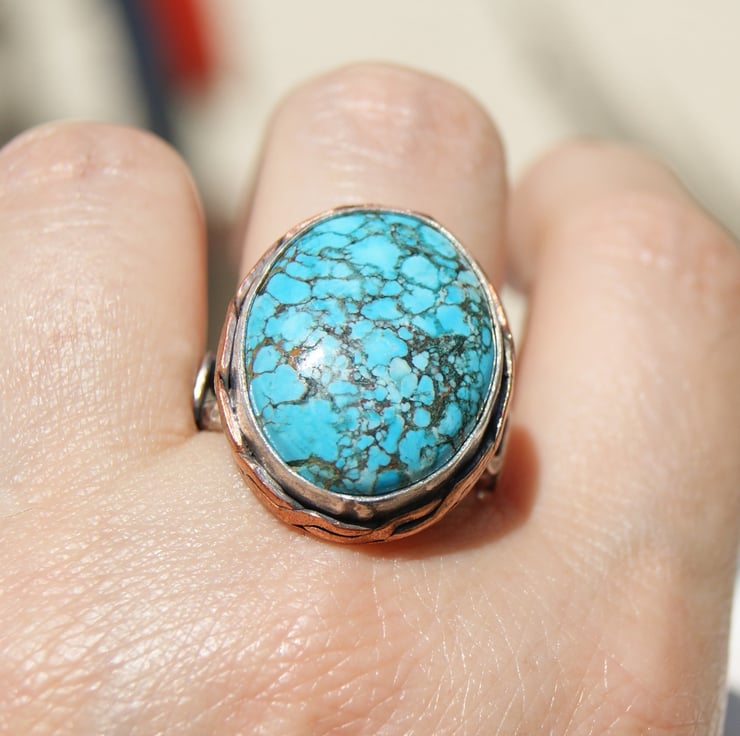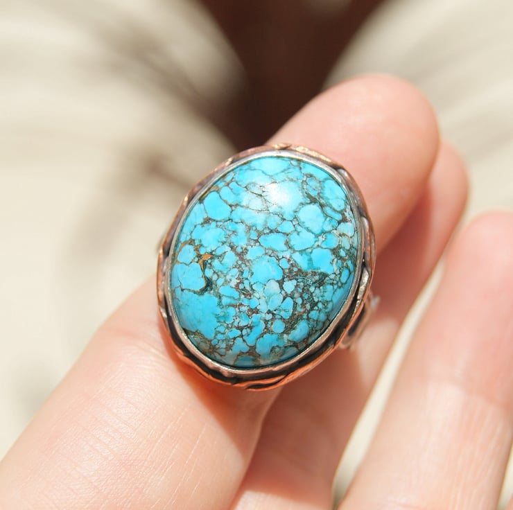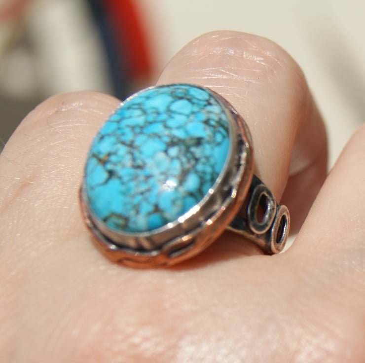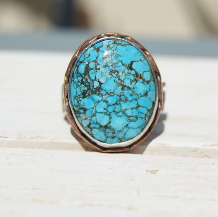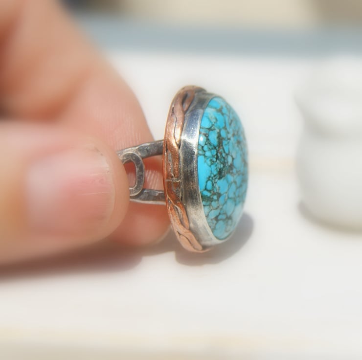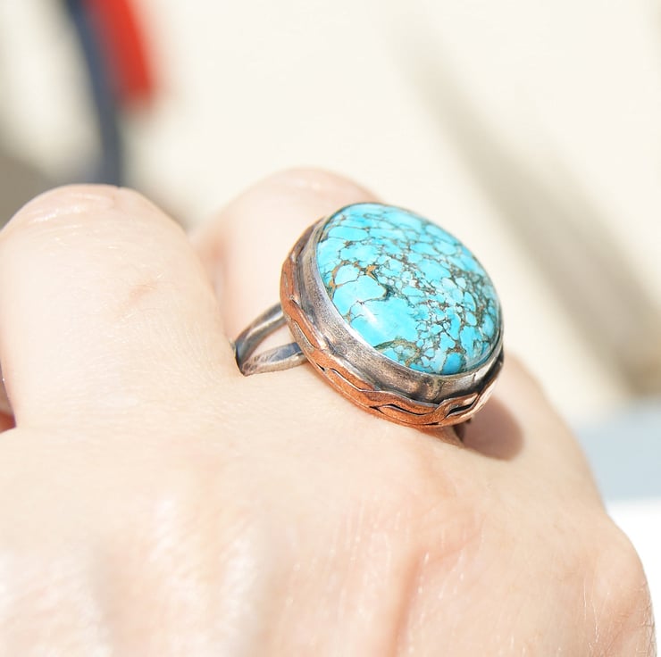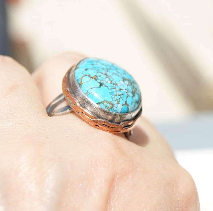 It is set in a sterling silver bezel setting with a copper backplate and sterling double band.