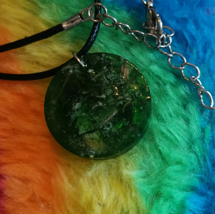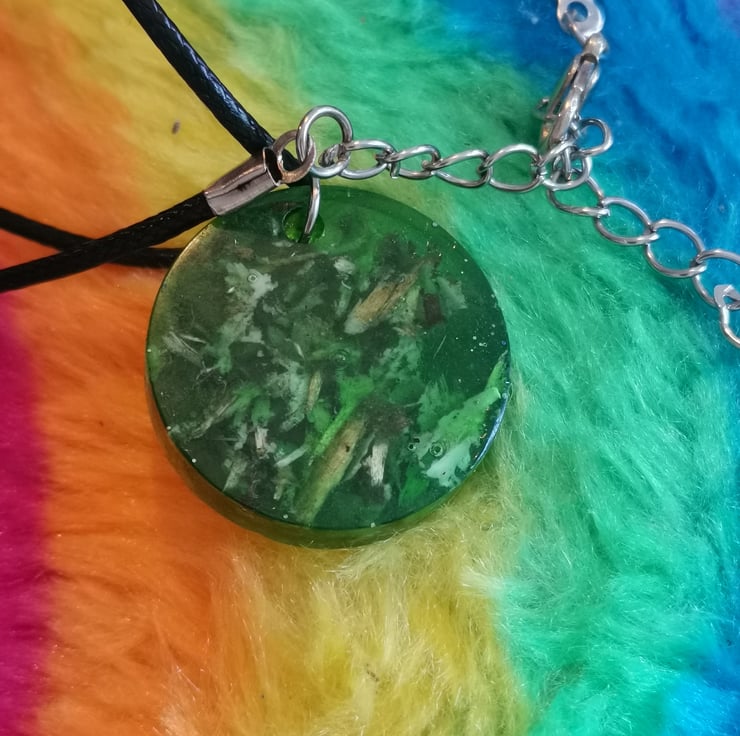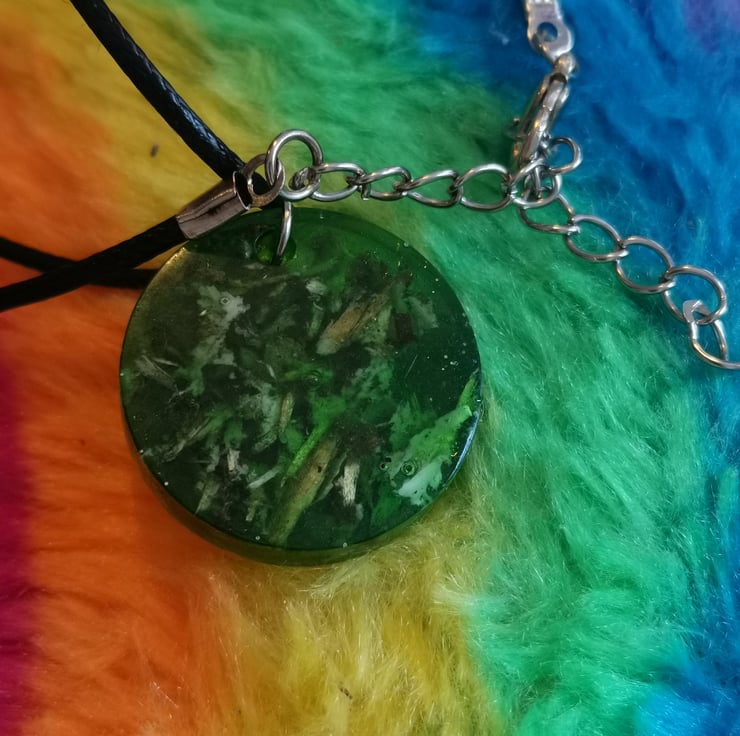 This lovely pendant is made from green ink mixed in clear resin with chips of wood added to give it a woodland feel