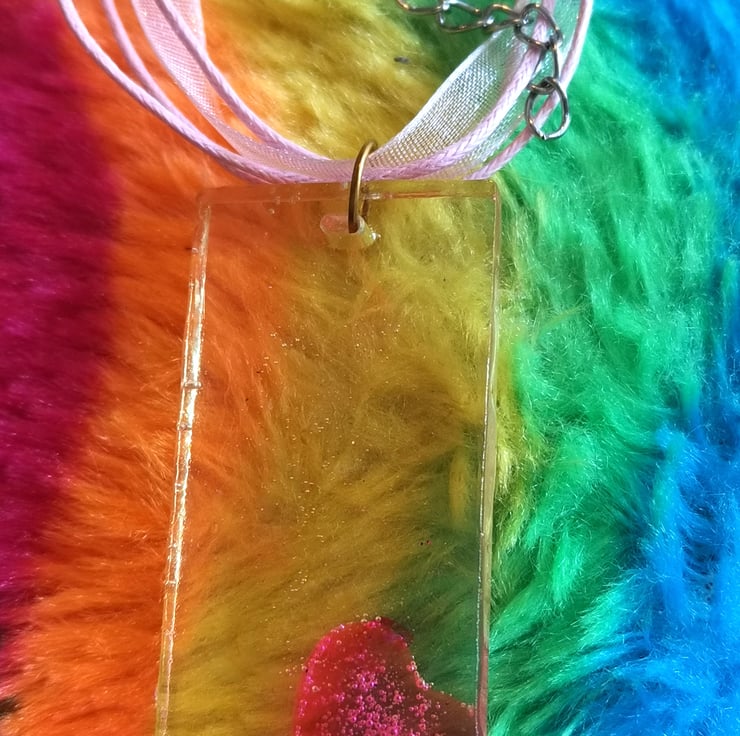 This little heart is in the corner of a clear resin pendant companied with a cord and ribbon necklace finished with a lobster clasp and exstenion chain
